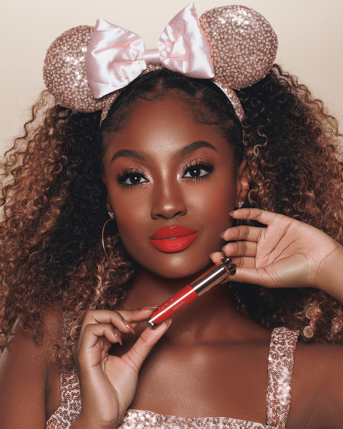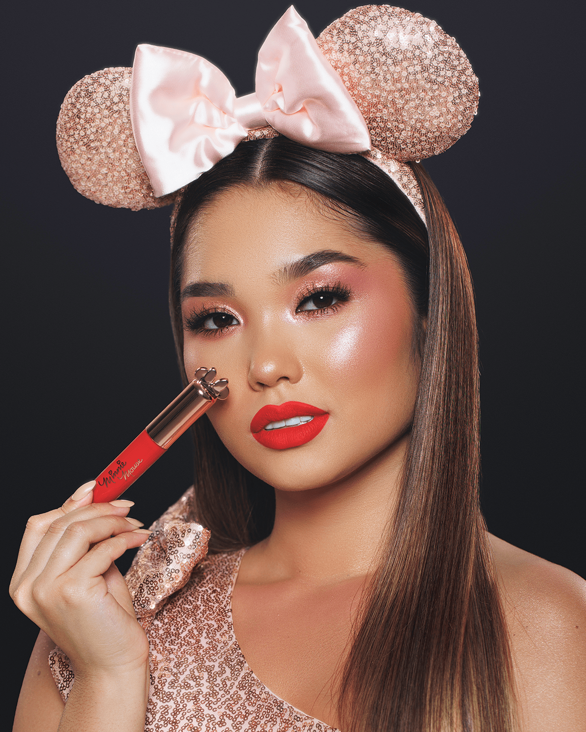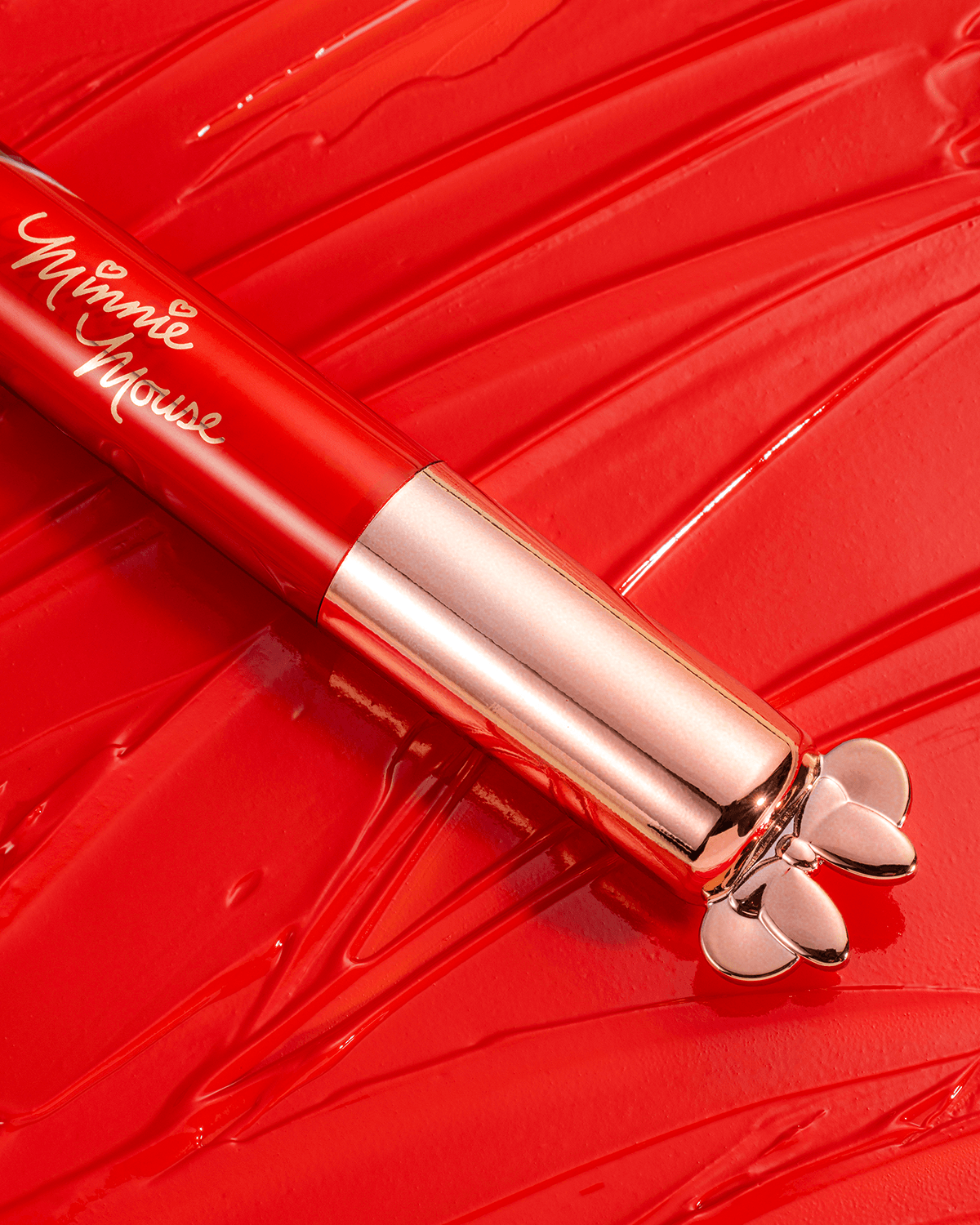 O batom líquido da coleção Minnie Mouse possui uma embalagem exclusiva com as orelhinhas e o clássico laço da musa atemporal da Disney. Um charme! A fórmula é ultra fina e confortável, garantindo um efeito liso e fosco aos lábios.