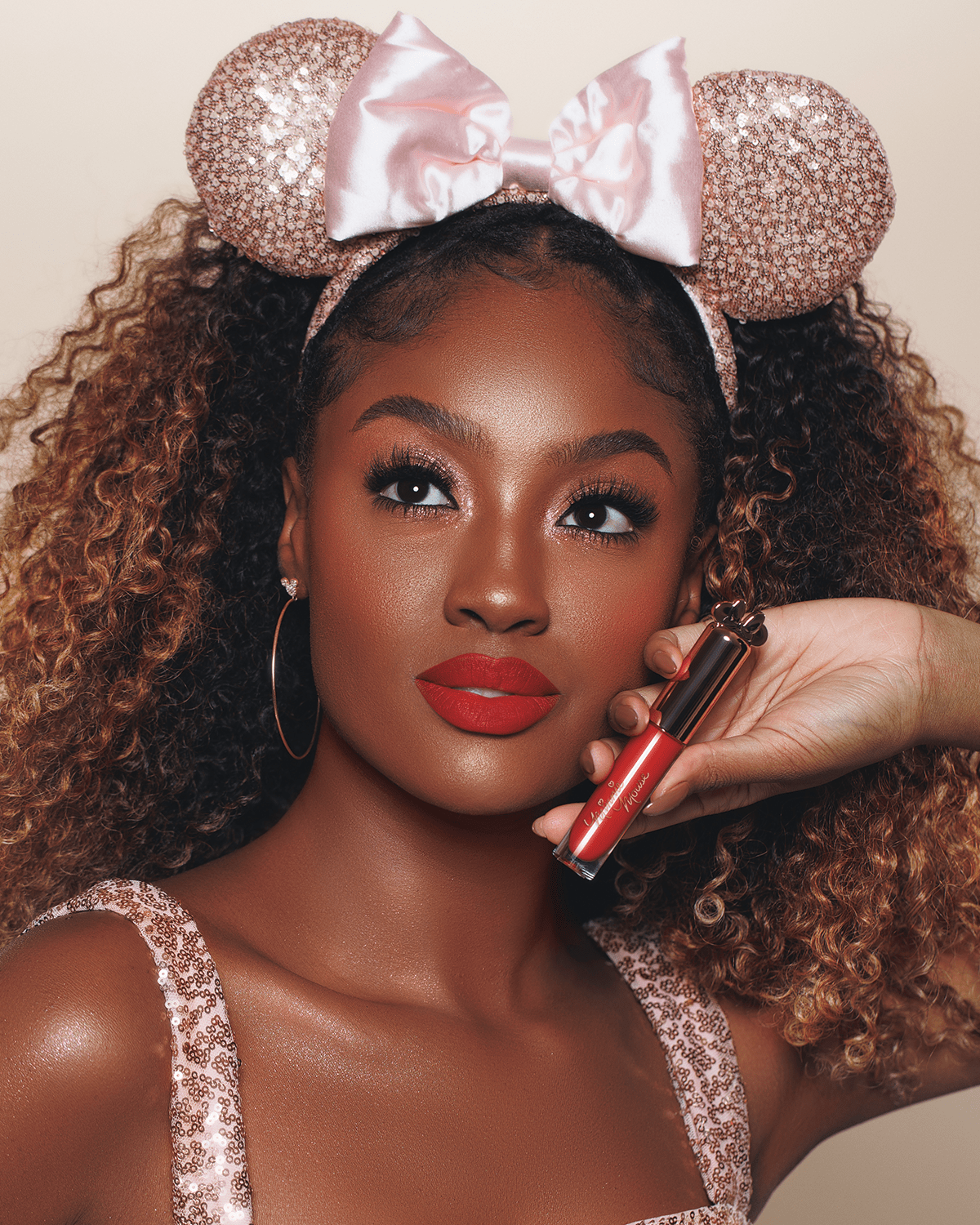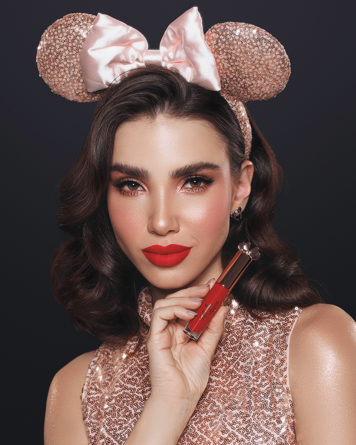 O batom líquido da coleção Minnie Mouse possui uma embalagem exclusiva com as orelhinhas e o clássico laço da musa atemporal da Disney. Um charme! A fórmula é ultra fina e confortável, garantindo um efeito liso e fosco aos lábios.