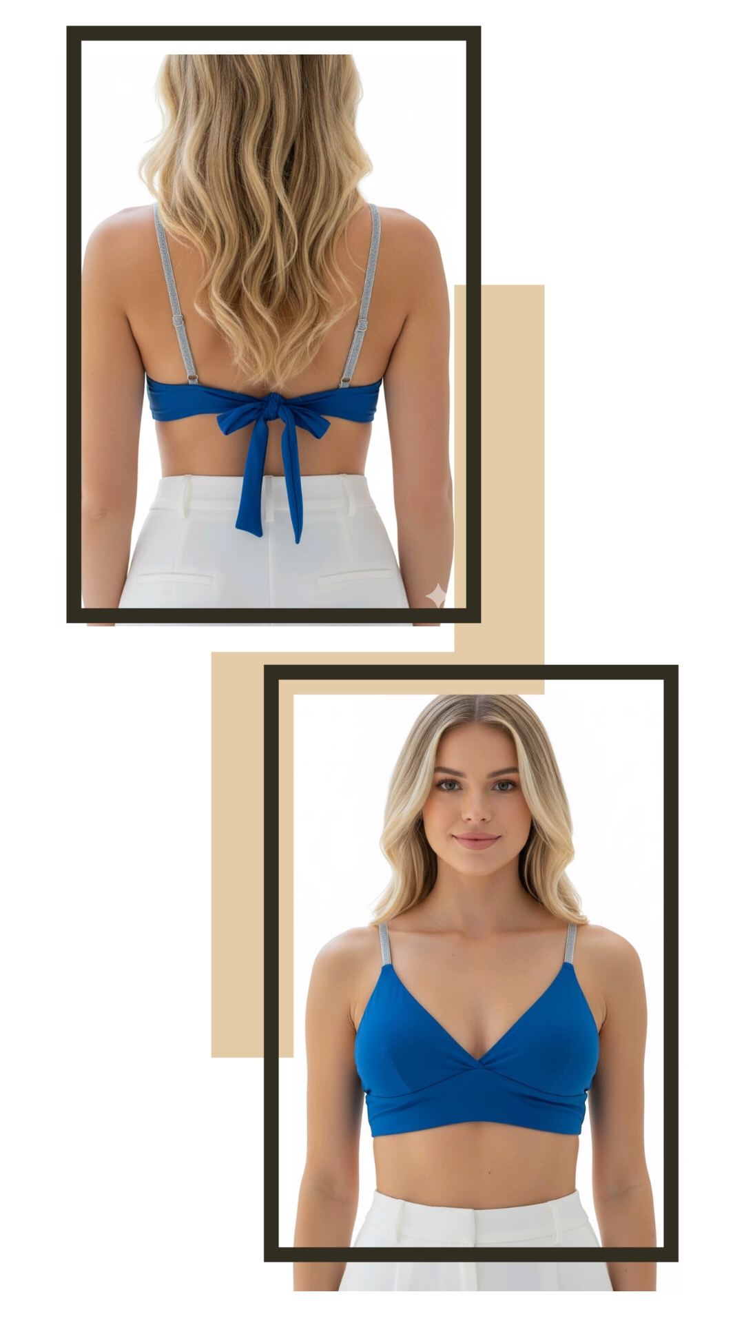 Tecido crepe duna, alça regulável, amarração nas costas e com bôjo.