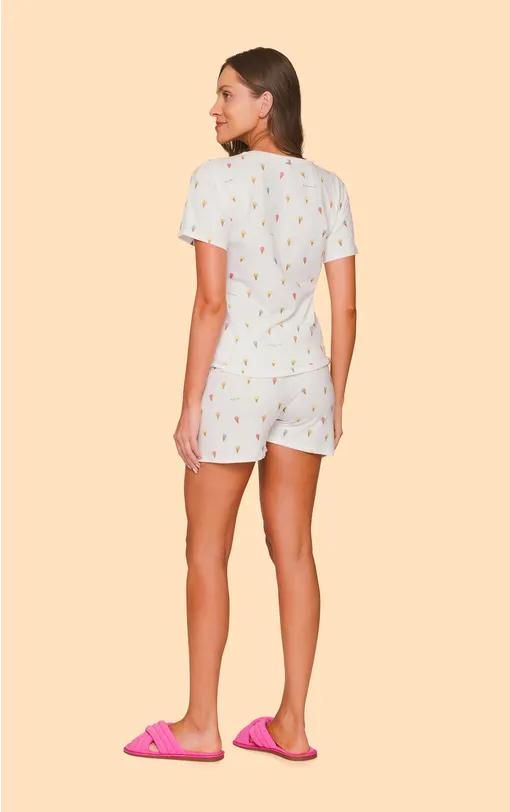 Pijama curto feminino em malha mercerizada estampada. Blusa de modelagem solta, com mangas curtas, decote redondo e um bolso frontal com bordado chenille com textura atoalhada. Shorts com elástico na cintura e um cadarço decorativo em cor contrastante.