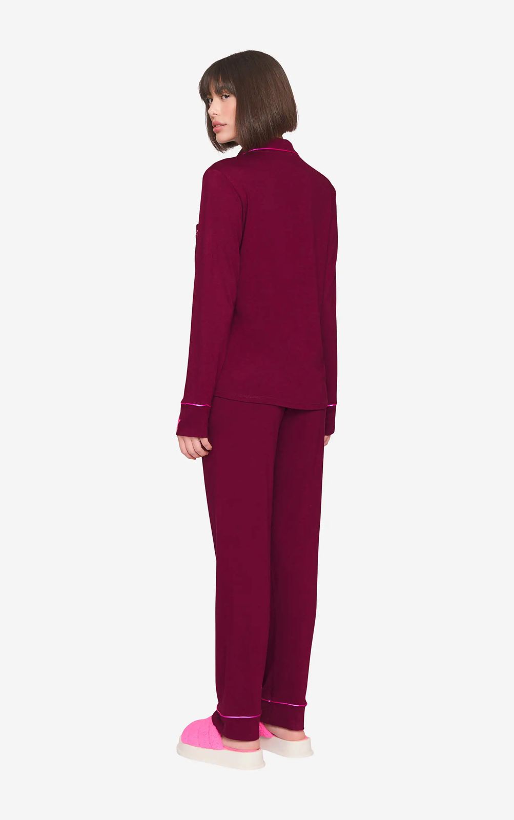 As cores das pedras preciosas comunicam autenticidade e sofisticação. Nesse coordenado ela aparece em looks monocromático como esse pijama aberto em viscolycra de toque aconchegante e se destaca pelo contraste dos filetes e bordado no punho em satinê enobrecendo a peça. Para quem aposta em novidades essa opção é certeira e elegante.