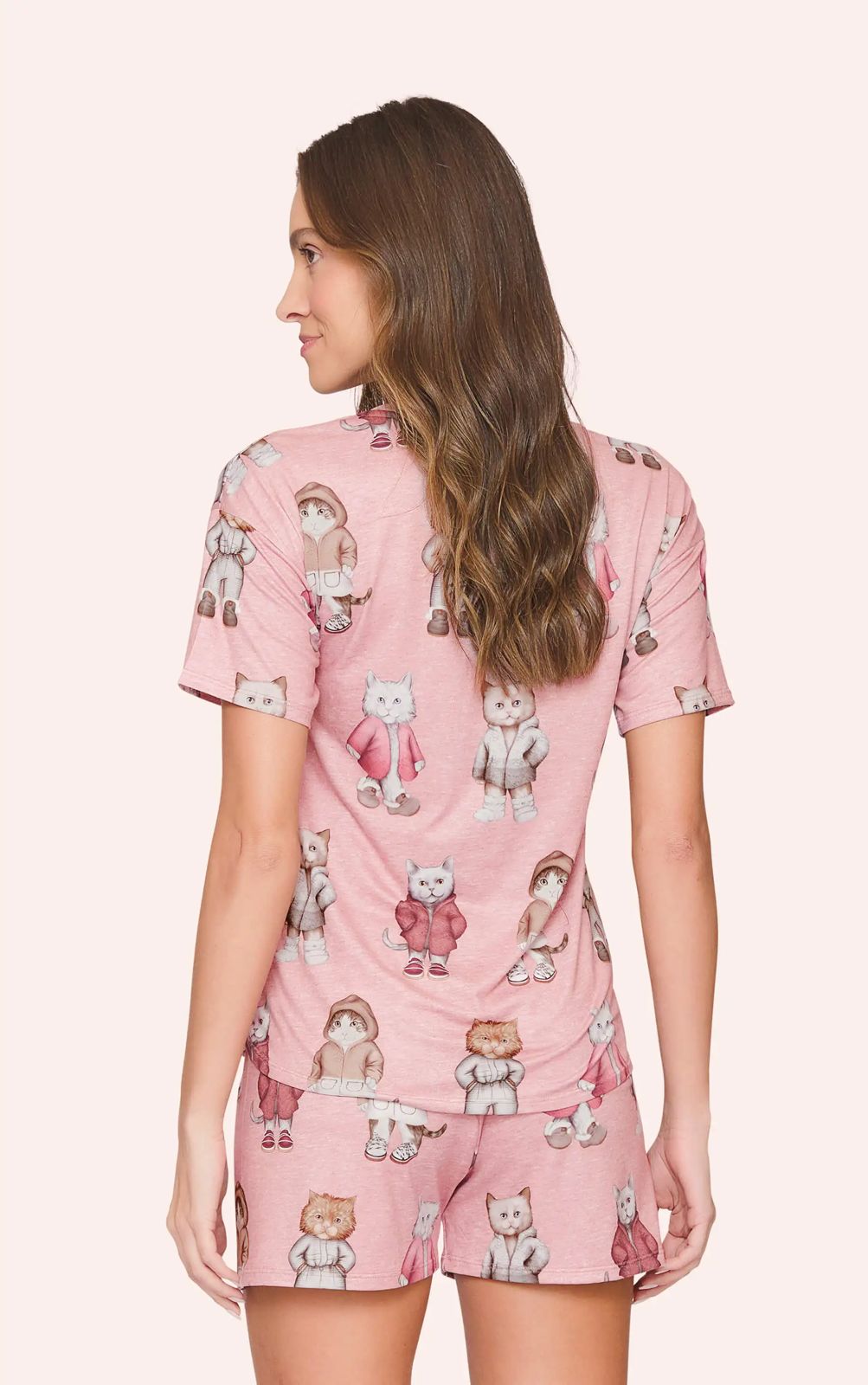 Esse pijama curto em sublime touch tem modelagem clássica e recebe ainda um bolso contrastante com recorte em pêlo premium flock para você se sentir mais próxima dos cats.