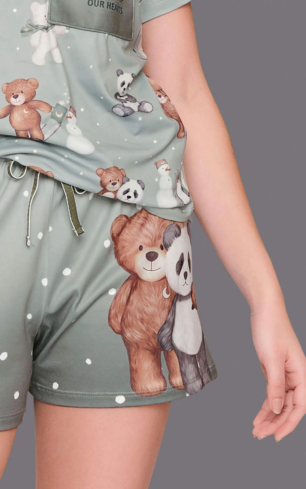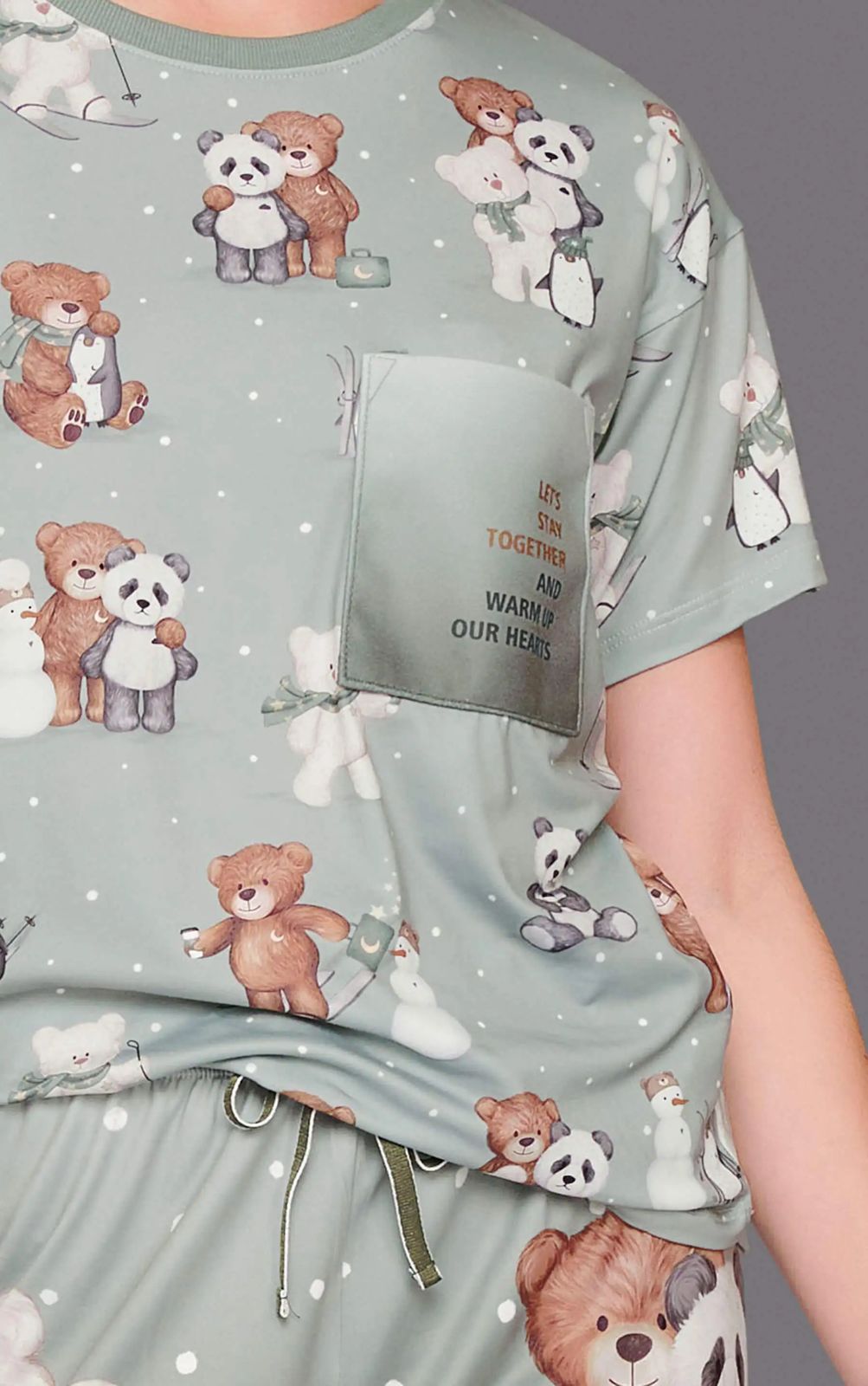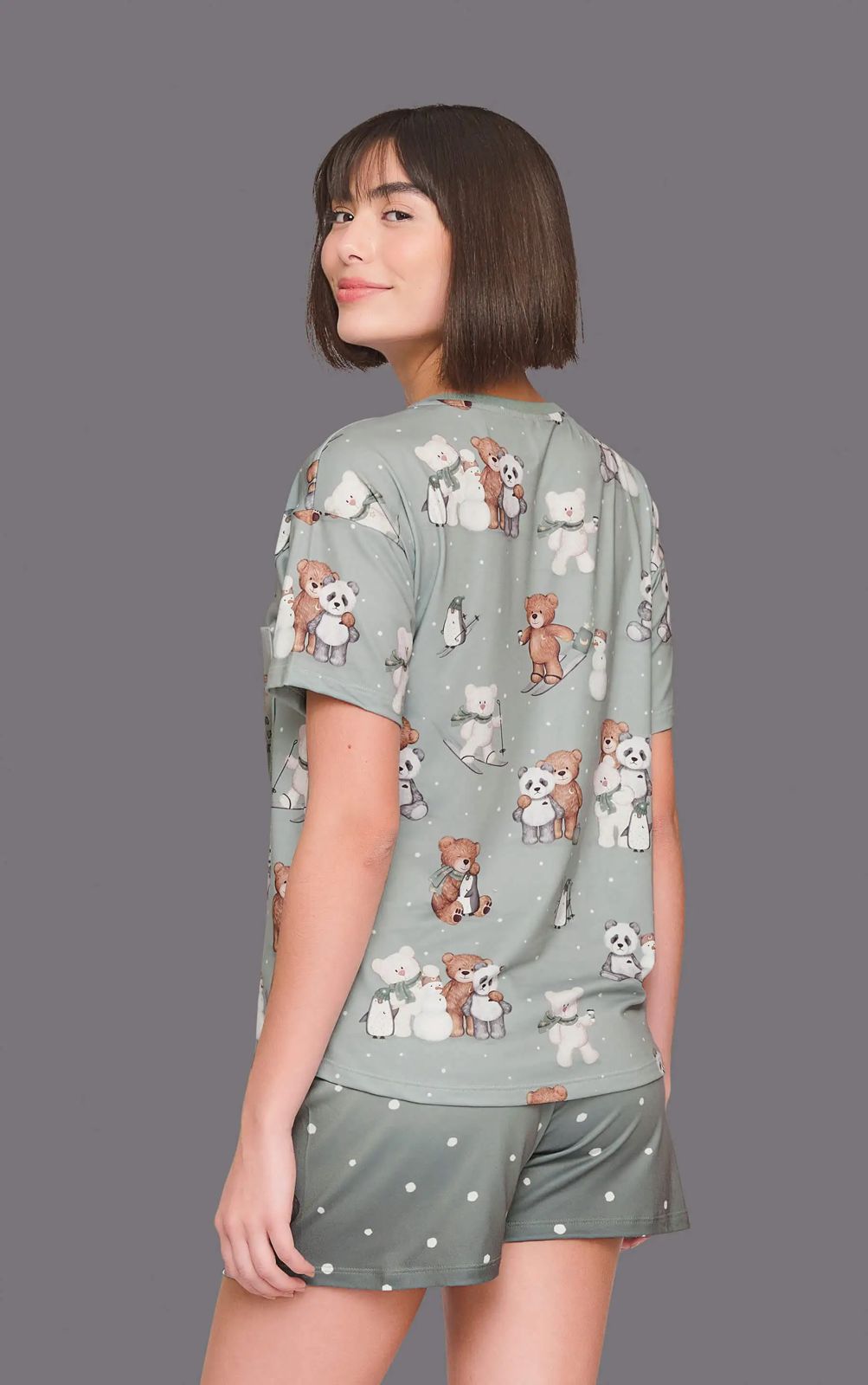 Este Pijama Curto, tem modelagem confortável, com t-shirt em estampa exclusiva dos amigos esquiando na neve... perceba a riqueza de detalhes da estamparia manual, toque zero. Os acabamentos em ribana 2X1 canelada dão um toque final à peça, que ainda é valorizada por bolso de pelúcia soft e escrita especial. O conjunto fica ainda mais incrível, com shorts em estampa localizada da turminha em versão maxi.