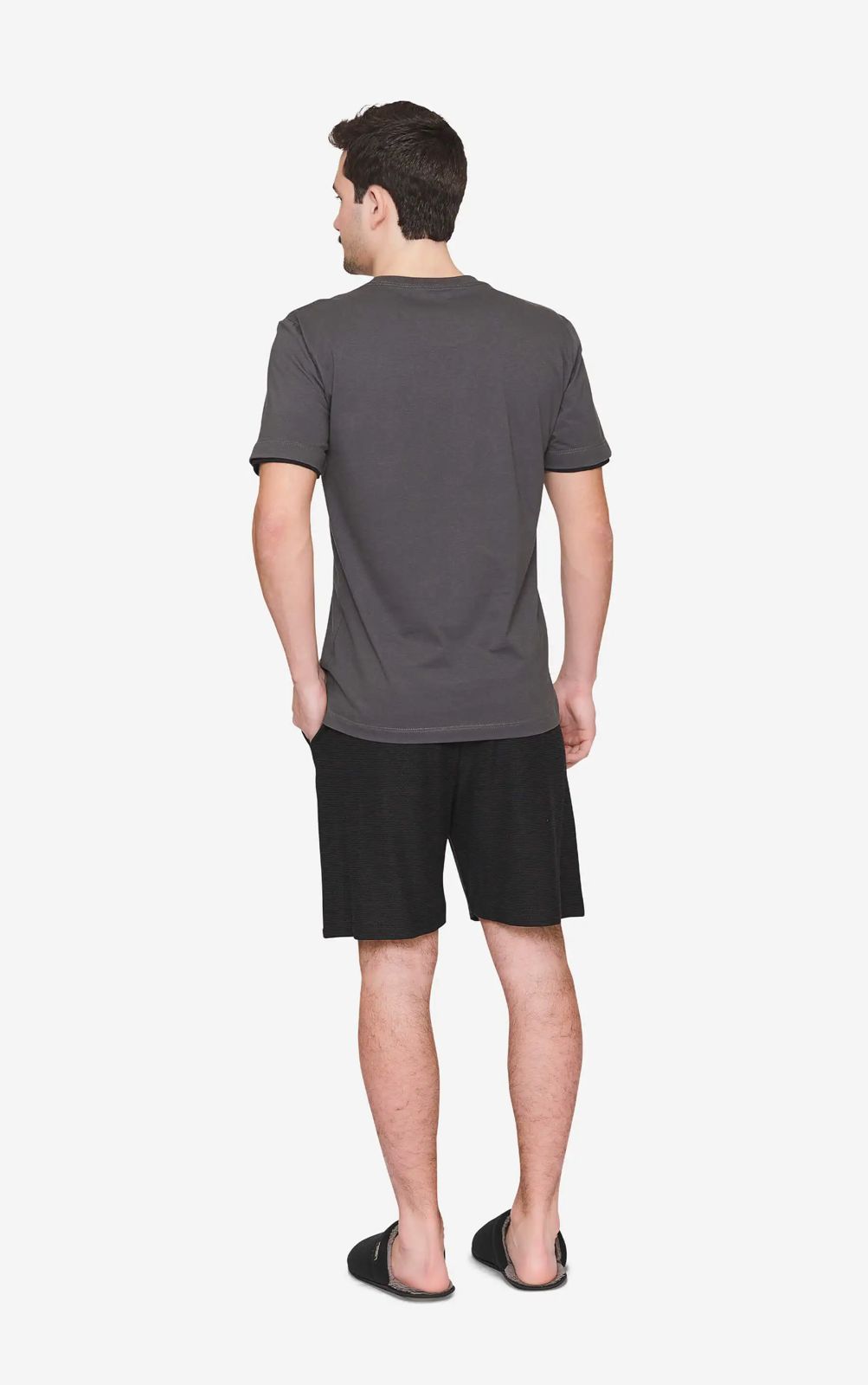 Pijama curto masculino tem sua camiseta em malha mercerizada, bolso com recorte e bordado. Bermuda em moletinho jacquard fio tinto, etiqueta de couro e cintura com cordão para ajuste.