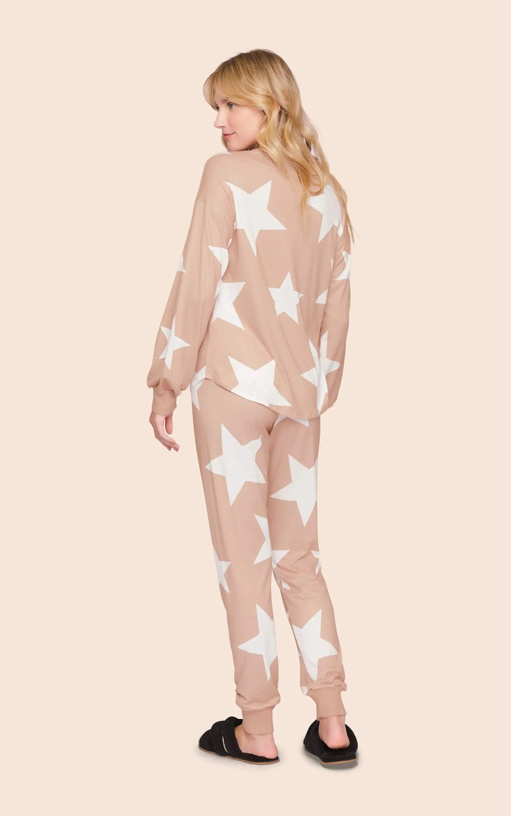 Pijama jogger em sublime touch com toque delicado e estampa na versão maxi com acabamento em canelado tricot touch, decote diferenciado que faz composição a estampa e a estrela bordada em chenille de textura atoalhada.