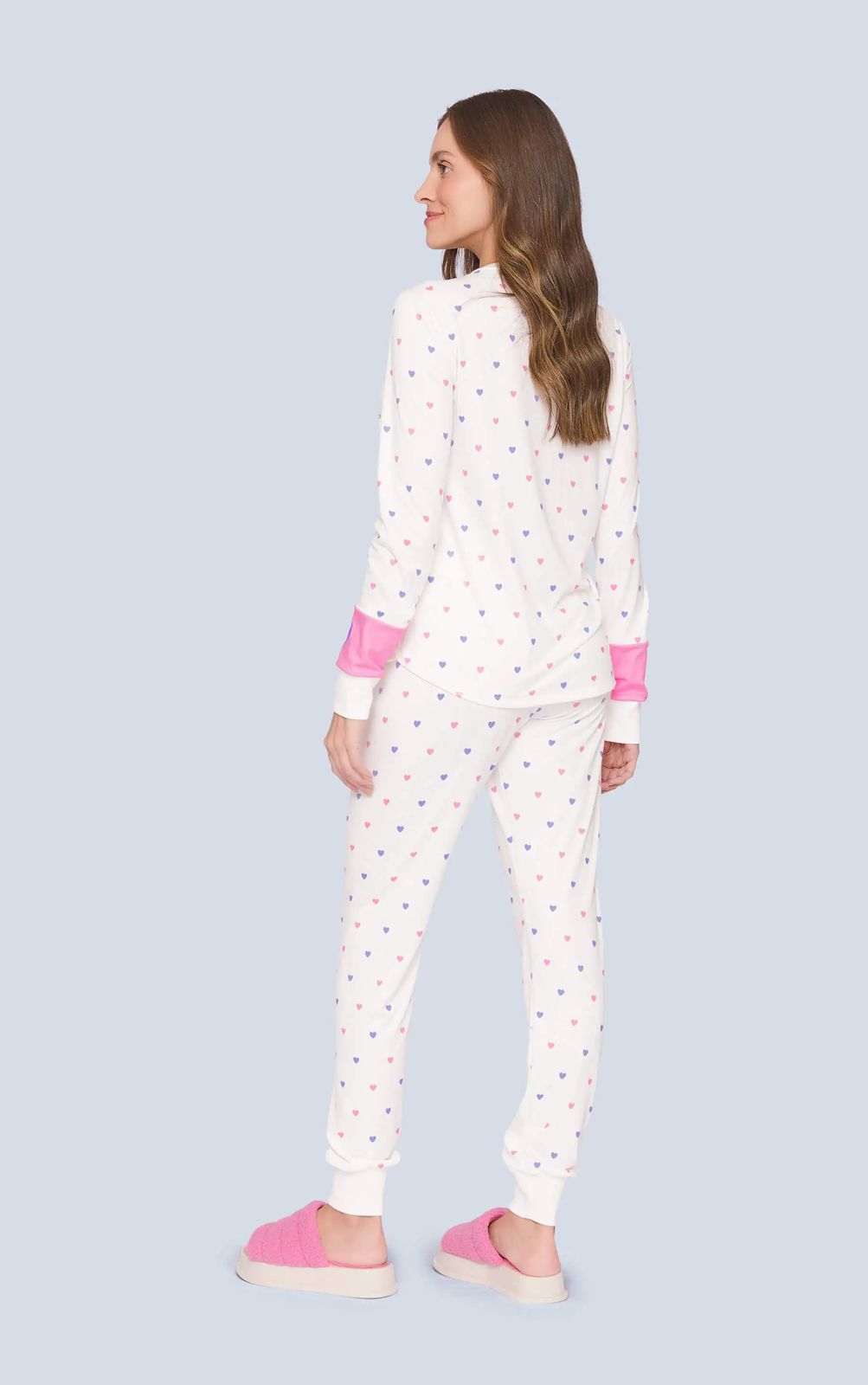 Os momentos de recarregar as energias são necessários para equilíbrio e bem estar principalmente quando estamos num mood delicado e aconchegante como nesse coordenado. Uma padronagem de mini corações num duo de cores alegres e femininas estampam esse pijama jogger em sublime touch de toque aveludado com acabamento em canelado e arte localizada no recorte das mangas que são em pelúcia. Curta o seu momento e acalme a sua mente.