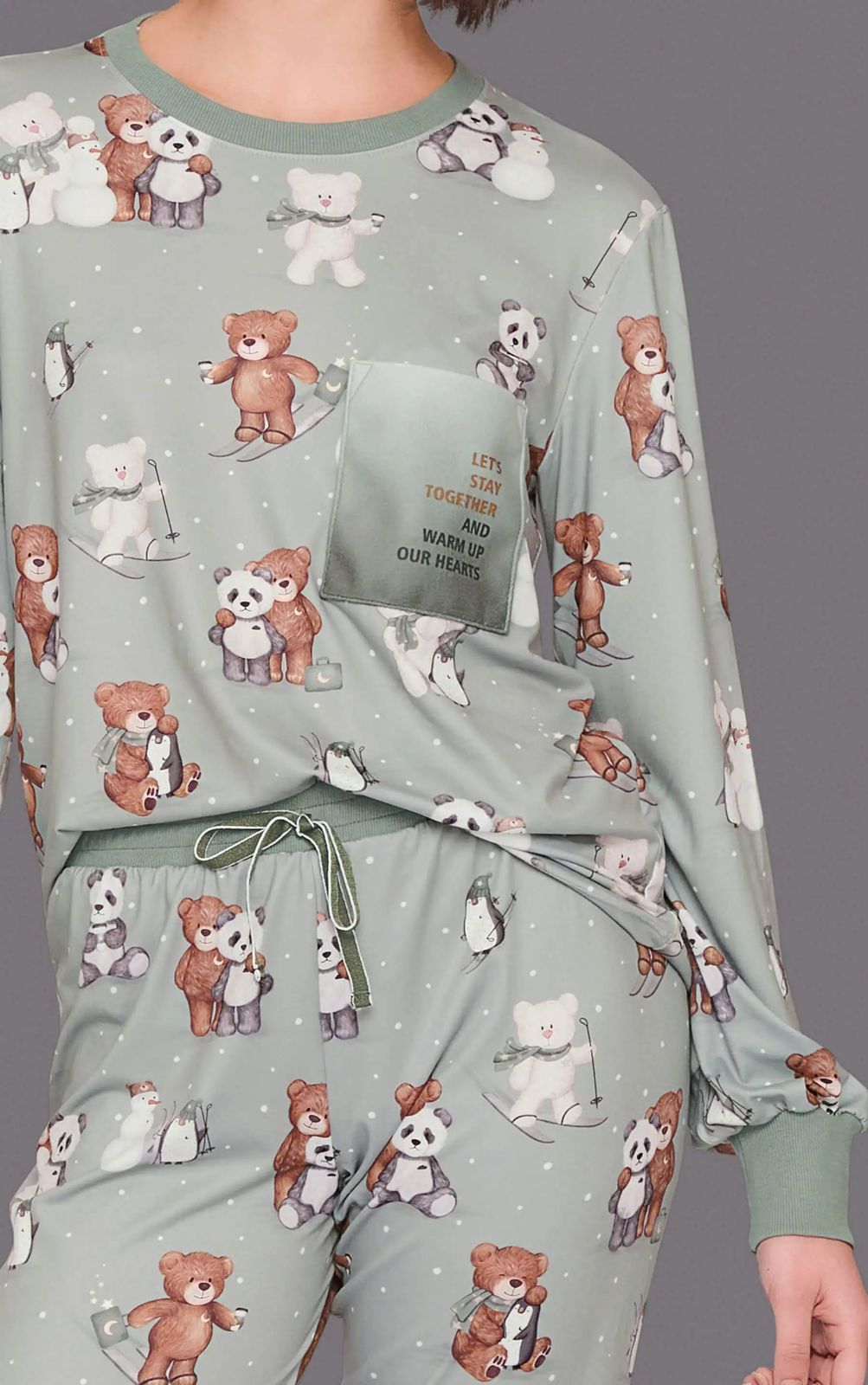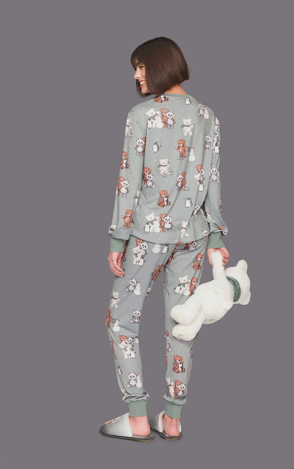Este Pijama Jogger, tem modelagem confortável, com estampa exclusiva dos amigos esquiando na neve... perceba a riqueza de detalhes da estamparia manual, toque zero. Os acabamentos em ribana 2X1 canelada dão um toque final à peça, que ainda é valorizada por bolso de pelúcia soft e escrita especial. O frio pode estar intenso lá fora, mas aqui dentro o seu momento de descanso é aquecido de forma única e surpreendente!
