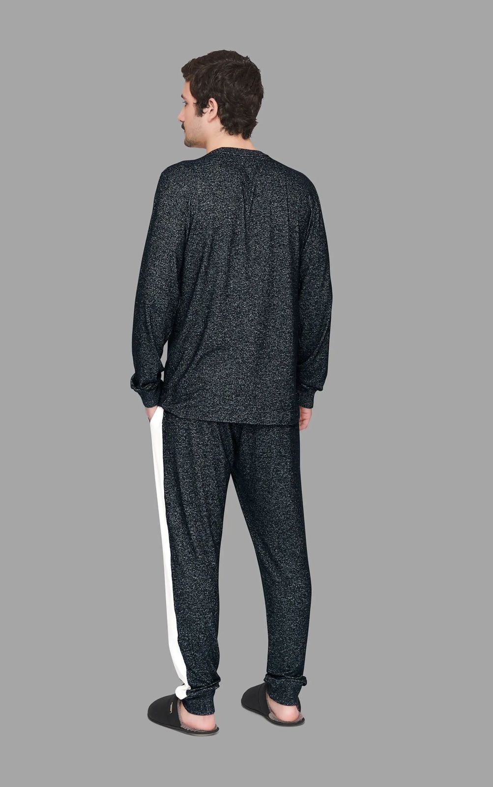 Um pijama jogger masculino para completar esse mood confortável. Em malha tricot touch, nobre de toque macio parecendo uma lã leve conta ainda com recortes modernos em cor contrastante e estampa localizada. Possui bolso lateral, elástico na cintura e cadarço para ajuste.