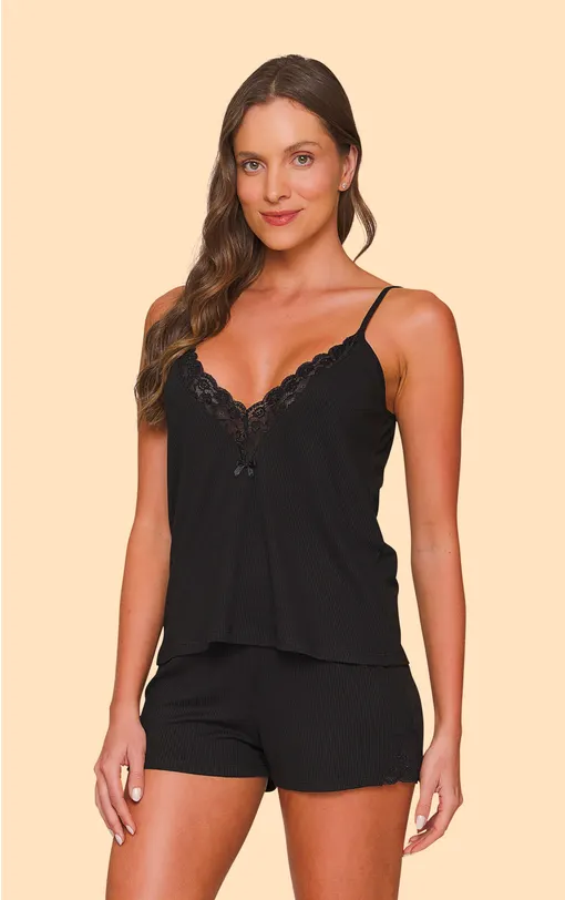 Short doll em canelado light, com toque macio e aconchegante, perfeita para o verão. Blusa com modelagem solta, alças ajustáveis e decote V profundo com forro e aplicação de renda. Um delicado aviamento de lacinho enfeita esta peça, adicionando um toque charmoso. No short, o elástico na cintura proporciona conforto, enquanto uma aplicação de renda nas laterais adiciona um toque refinado.
