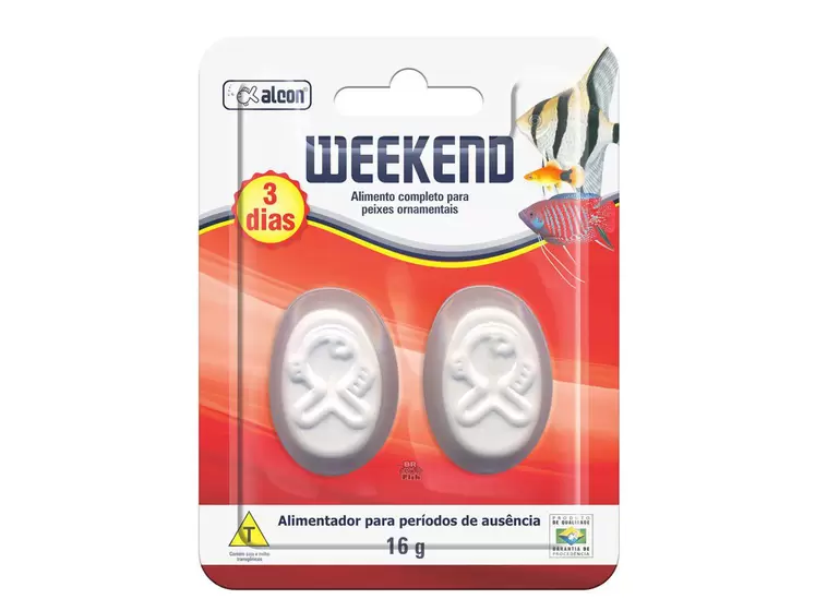 Alcon WEEKEND constitui-se de um bloco alimentador, tendo o sulfato de cálcio como suporte de pequenos grânulos de ração para peixes ornamentais. Após mergulhado na água o sulfato de cálcio vai lentamente se dissolvendo e liberando grânulos de alimento para os peixes. Modo de usar: Coloque o alimentador no aquário, mantenha o pH entre 6,8 e 7,2 e a temperatura em torno de 24ºC. Duração: De 2 a 4 dias por unidade, conforme o pH da água. É importante acompanhar o pH pois o alimentador não se dissolverá em água com alto teor de alcalinidade. É recomendável manter o ambiente iluminado e apagar a luz do aquário, principalmente no verão, quando as lâmpadas do aquário podem transmitir excesso de calor à água. Não recomendamos este tipo de alimento em aquários que não estejam equipados com filtro e aerador. Ingredientes: Farinha de Peixe Farelo de Soja Farinha de Milho Farinha de Camarão Pimentão Desidratado Cenoura Desidratada Leveduras Sal Óleo Vegetal Níveis de Garantia: Umidade (máx) 8% Proteína Bruta (min) 30% Extrato Etéreo (min) 3% Matéria Fibrosa (máx) 9% Matéria Mineral (máx) 5% Cálcio (máx) 4% Fósforo (min) 0,6%