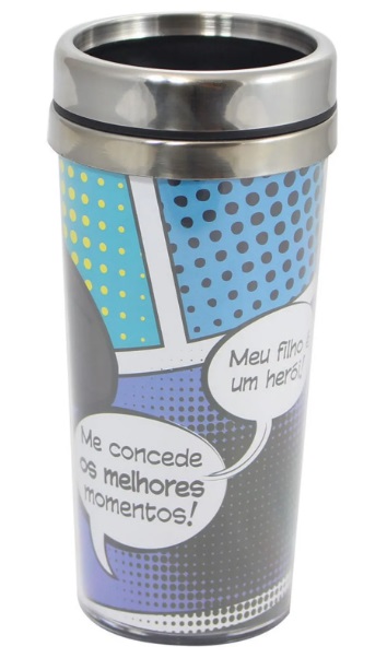 Se você tem um SUPER FILHO, não pode deixar de presenteá-lo com este super copo térmico que vai manter a temperatura da bebida quente ou fria por muito mais tempo. Agora ele vai poder tomar sua bebida favorita sabendo o quanto é importante pra você. Descrição Técnica: Material: Alumínio e Plástico Dimensões: L9 x A19 x P9 (cm) Capacidade: 450ml Peso: 200g Cuidados: lavar com água e sabão neutro, não usar produtos abrasivos e evitar o lado áspero da esponja. Atenção: choques e quedas podem danificar o produto, o transporte de forma horizontal pode acarretar vazamentos.
