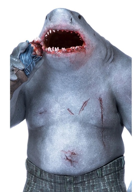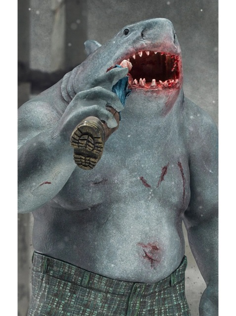 Usando apenas uma bermuda, a corpulenta criatura escancara sua funesta boca, com dezenas de dentes triangulares bem afiados, para degustar um peculiar e bizarro petisco, ignorando as feridas e cicatrizes espalhadas por sua espessa pele cinza-azulada, ele aparenta uma tranquilidade temporária, mas está sempre pronto e disposto a seguir em busca de saciar sua constante e voraz fome. Representado na estátua "King Shark BDS Art Scale 1/10 - The Suicide Squad - Iron Studios", chega o mais temido (e às vezes cômico) predador aquático do universo DC, membro do grupo Esquadrão Suicida.