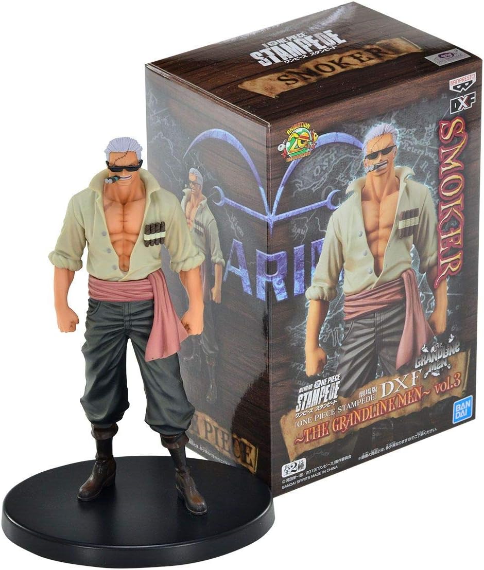 smoker o caçador branco da série de anime one piece é um oficial da marinha estacionado na base do g-5 Ele foi apresentado pela primeira vez como capitão em loguetown onde assumiu como missão capturar luffy e depois foi promovido ao posto de comodoro devido aos eventos em alabasta Em algum momento do período ele foi promovido a vice-almirante devido a suas ações contra luffy em loguetown smoker pode ser considerado o principal antagonista do arco de loguetown característica smoker é um homem musculoso de cabelos brancos (verde-azul claro no anime pré-timeskip) e de olhos castanhos com uma característica distinta de sempre ser visto fumando dois charutos ao mesmo tempo ele veste uma jaqueta marinha grossa branca e azul grande e espessa que mantém aberta com pêlos esverdeados no pescoço pulsos e bainha a jaqueta traz o kanji para "justiça" escrito na parte de trás Muitos charutos estão amarrados à jaqueta ele carrega um jitte com ponta de seastone como arma embora tenha sido quebrado duas vezes uma durante a batalha de marineford por boa hancock e uma vez em punk hazard da vergo ele também usa luvas de couro marrom jeans azul com cinto marrom e grandes botas de couro marrom de edição militar Além disso durante seu tempo em alabasta ele também usava óculos o fato de ele andar de moto customizada dá a impressão de um fuzileiro naval delinqüente no mangá seu cabelo tem um tom branco e o pêlo de seu casaco era inicialmente azul depois mudou para verde escuro e finalmente modificado para seguir o anime embora com um tom verde muito mais claro e com zíperes verdes também durante a sua estada em uma ilha desconhecida da grand line ele foi visto sem a jaqueta que ele carregava com um subordinado durante esse período ele foi visto mantendo o jitte amarrado nas costas por meio de uma série de cintos Uma cicatriz era visível no lado direito do peito dados técnicos fabricante bandai banpresto série one piece material pvc tamanho 17 cm