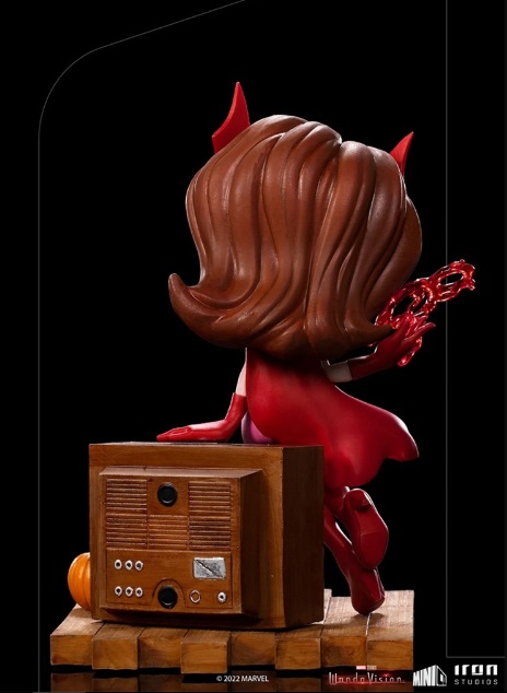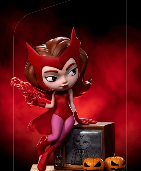 Brincando com seus poderes místicos, a bela feiticeira de cabelos ruivos se apoia em um antigo aparelho de TV, fazendo surgir em sua tela a imagem de seu amado marido, o sintozóide Vision (Visão), tal como em uma antiga série em preto e branco. Usando um collant com botas, luvas e capa vermelha, além de sua clássica tiara, a vingadora Wanda Maximoff surge com seu visual dos quadrinhos Marvel, pronta para celebrar o Halloween como uma "Vidente Sokoviana", com pequenas abóboras decoradas para a data adornando sua base. A Iron Studios apresenta sua estátua "Wanda Halloween Version - WandaVision - MiniCo" com a poderosa Feiticeira Escarlate no formato estilizado MiniCo, inspirada em "All-New Halloween Spooktacular!