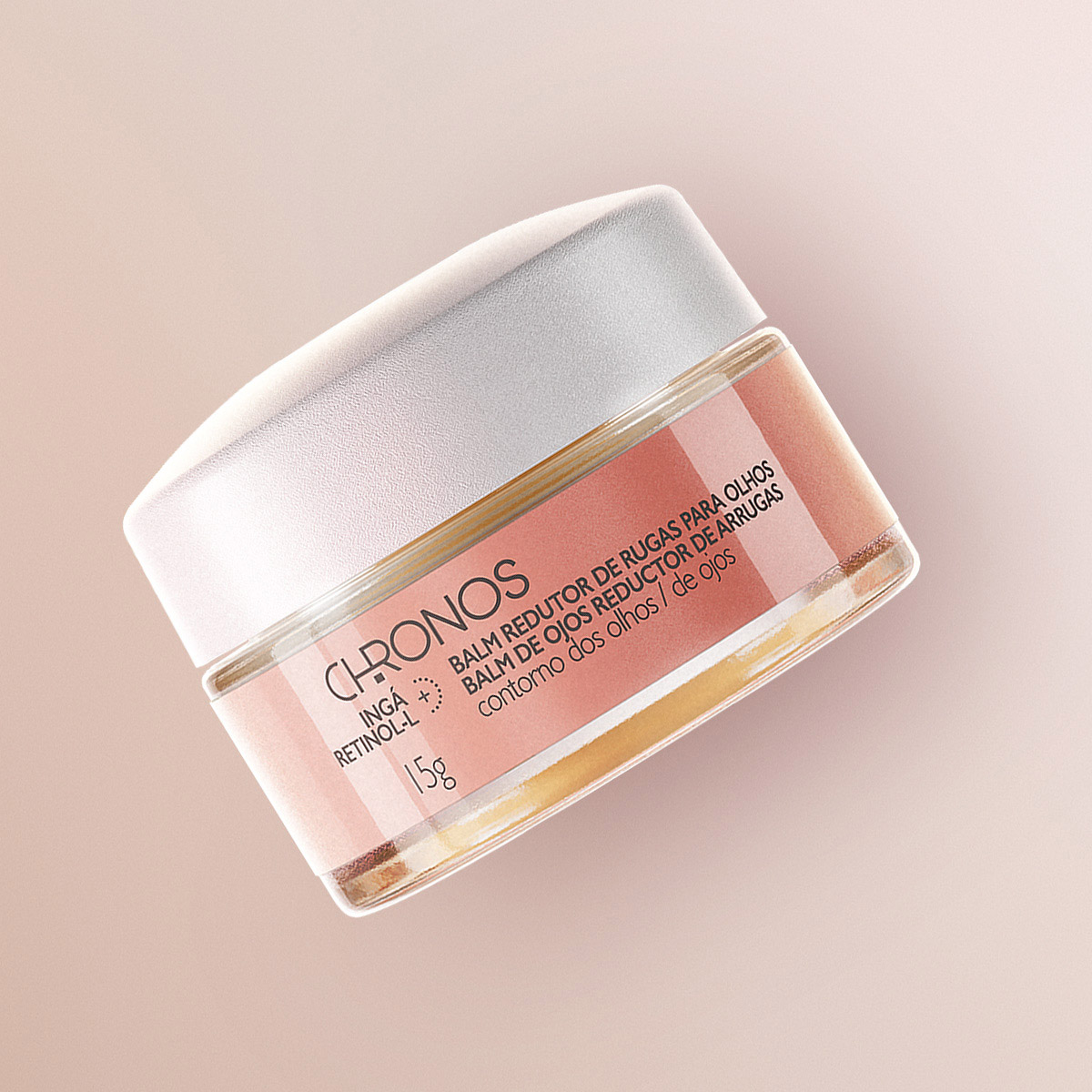 Suaviza os sinais de cansaço e deixa a pele com mais vitalidade. O Balm Redutor de Rugas para Olhos Chronos oferece uma solução completa que reduz, previne e hidrata. Sua fórmula com tecnologia exclusiva, que combina Natureza (Ingá) e Ciência (Retinol-L), reduz linhas finas e rugas, previne sinais do envelhecimento e hidrata intensamente a pele da região dos olhos. Possui textura balm confortável, aveludada e fácil de espalhar. Benefícios • Reduz linhas finas e rugas. • Previne sinais do envelhecimento precoce. • Hidrata intensamente. • 100% das mulheres perceberam sua pele mais hidratada.* • Deixa a pele com mais vitalidade, luminosidade e suaviza os sinais de cansaço. • Fórmula balm com textura confortável, aveludada e fácil de espalhar. • Mantém a maquiagem dos olhos por mais tempo. • Fórmula com tecnologia exclusiva Chronos: Natureza (Ingá) + Ciência (Retinol-L). Dicas de Uso Com o auxílio da espátula, retire o produto e aplique no contorno dos olhos, duas vezes ao dia.