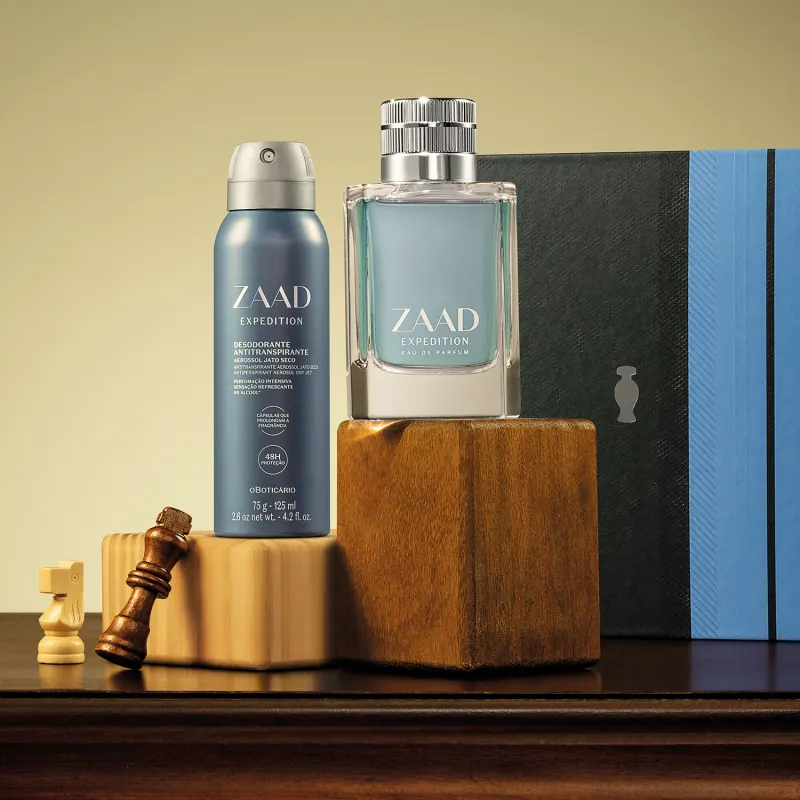 EAU DE PARFUM Com uma perfumação intensiva, o Segredo exótico de Zaad Expedition Eau De Parfum está no Vetiver, cuja raíz profunda traz amadeirado seco e terroso que envolvem a fragrância com riqueza e vivacidade, acompanhado do cítrico vibrante da Mandarina e Grapefruit e do frescor robusto e volumoso da Sálvia, com nuances metálicas e minerais. Família Olfativa: Amadeirado Aromático DESODORANTE ANTITRANSPIRANTE Com cápsulas que prolongam a fragrância o Desodorante Antitranspirante Aerossol Zaad Expedition entrega jato seco, 48 horas de proteção e sensação refrescante, além do inconfundível aroma de Zaad Expedition, para fazer parte da rotina. CAIXA DE PRESENTE A caixa para presente imprime a sofisticação aos Kits de Dia dos Pais: A cor azul forma duas faixas desenhadas na caixa. A ânfora, símbolo de O Boticário, é o grande destaque. O material, em caixa rígida, é ideal para ser reaproveitado como um excelente organizador. Dimensões: 21 x 21 x 7,5 cm