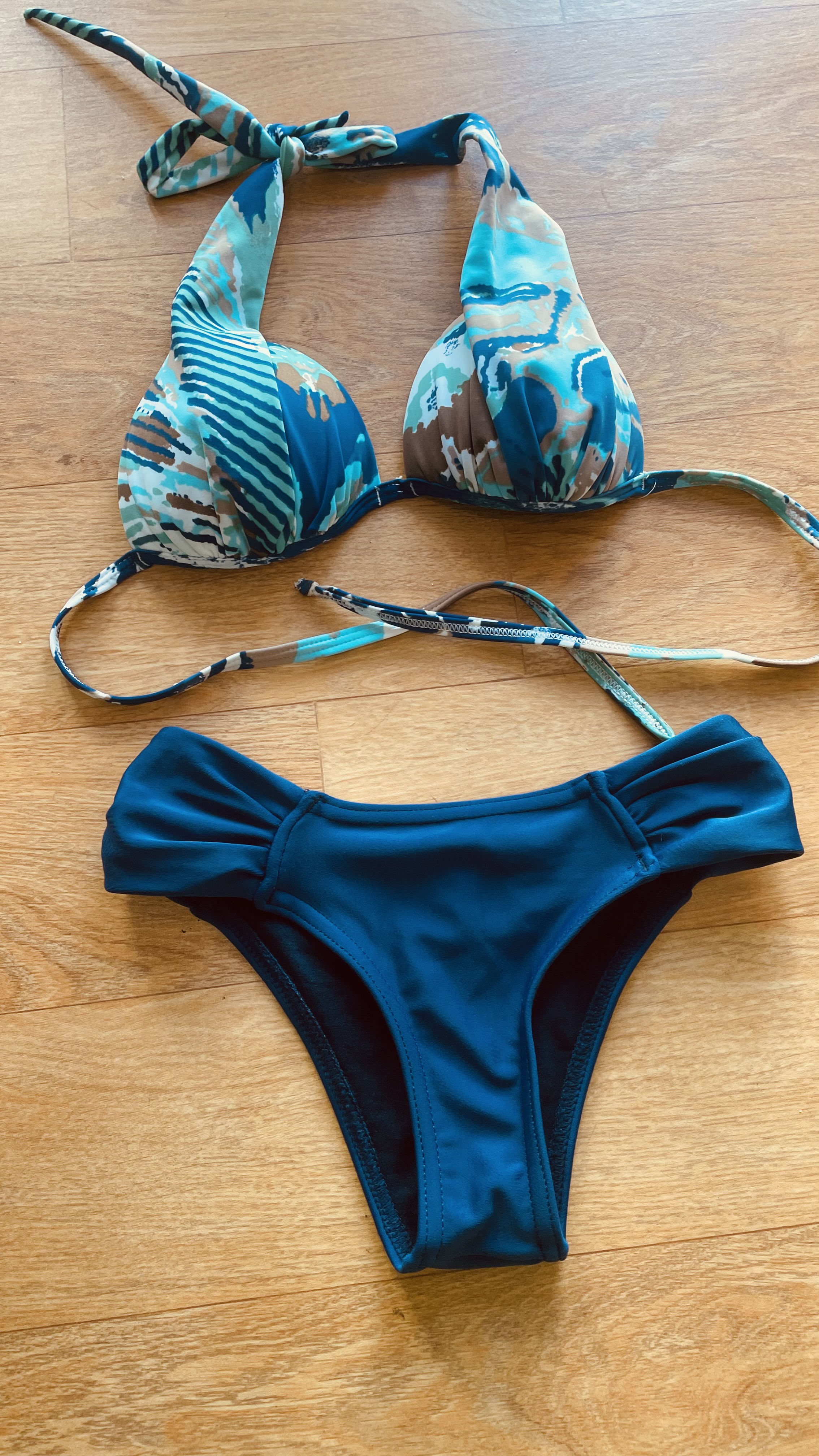 une estampa moderna com modelagem confortável! O top cortininha possui bojo estruturado e amarração no pescoço e costas, garantindo ajuste perfeito ao corpo. A calcinha azul-marinho, com detalhe franzido nas laterais, proporciona encaixe anatômico e valorização das curvas. 🌊 Composição: • 84% Poliamida • 16% Elastano