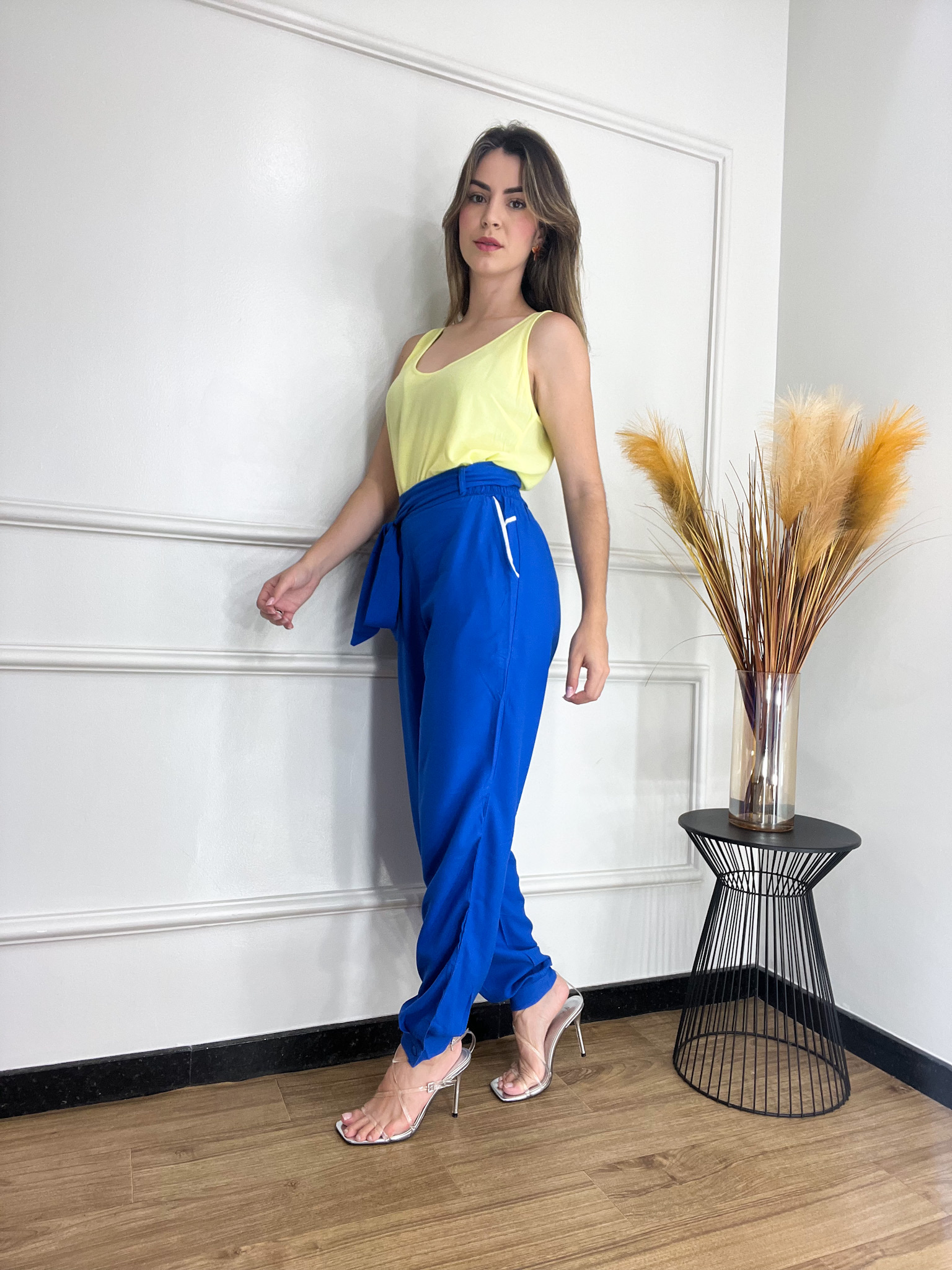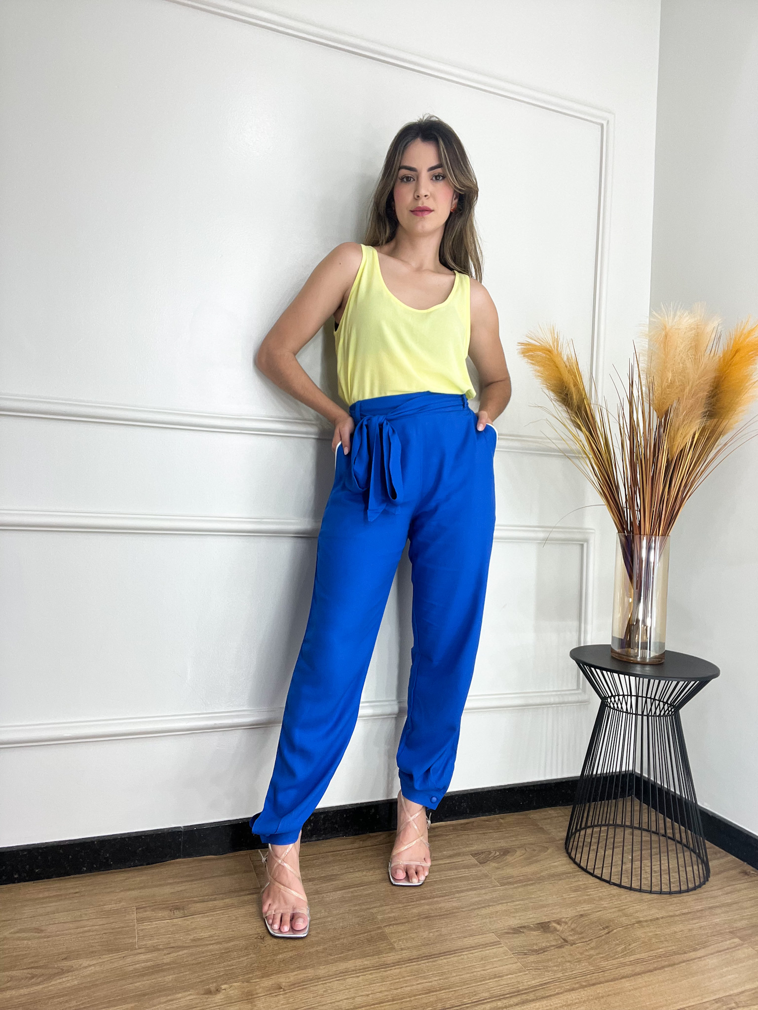 Descrição: Calça lisa com design moderno e detalhes elegantes, ideal para compor looks versáteis e estilosos. • Detalhes: Faixa para amarração no mesmo tecido, bolsos frontais com contraste de vivo, e botões decorativos na barra. • Elástico na parte traseira para maior conforto e ajuste perfeito. • Fechamento na barra com botões, conferindo um toque diferenciado. Peça em tecido leve e sofisticado, ideal para diversas ocasiões. Sugestão de estilo: Combine com blusas básicas para um look casual ou com camisas para ocasiões mais formais. Aposte em saltos ou sapatilhas para diferentes propostas de estilo.
