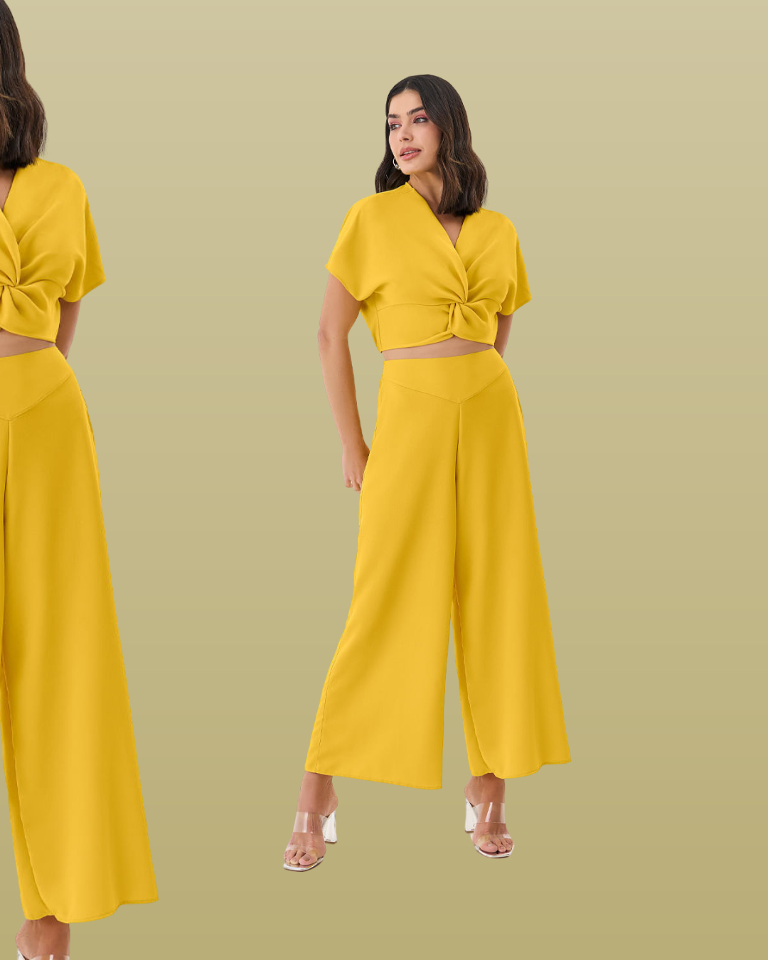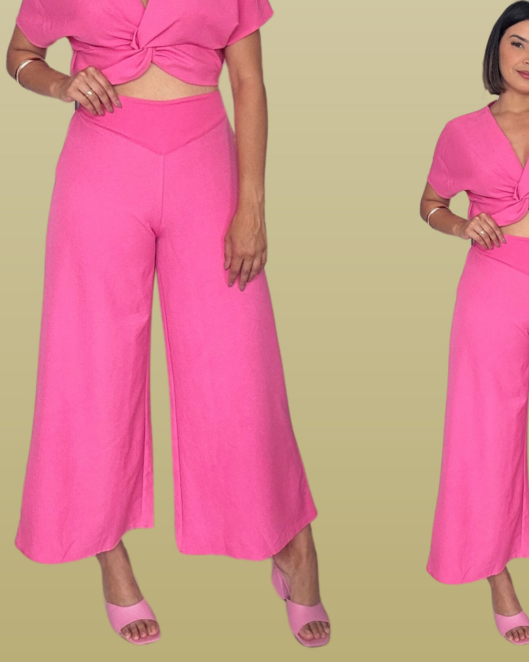 Calça pantalona creponada, com comprimento que remete ao estilo pantacourt. Apresenta cós com detalhe de costura frontal, elástico na parte de trás para maior conforto e ajuste. Sem bolsos e não possui forro. Uma peça versátil que combina elegância e leveza para os dias quentes.