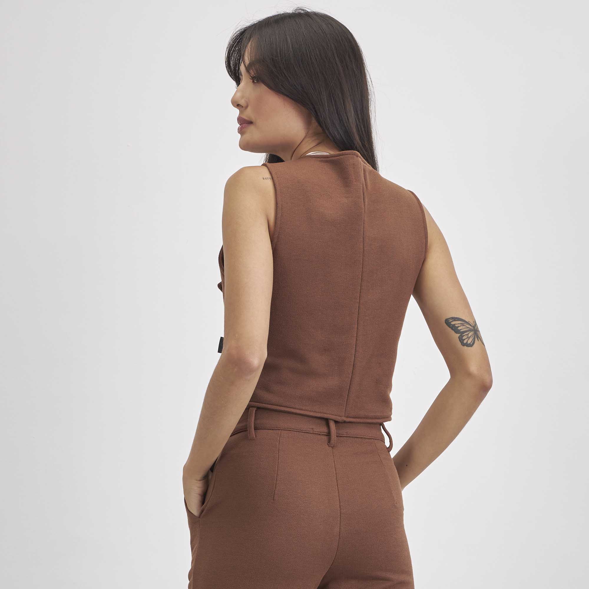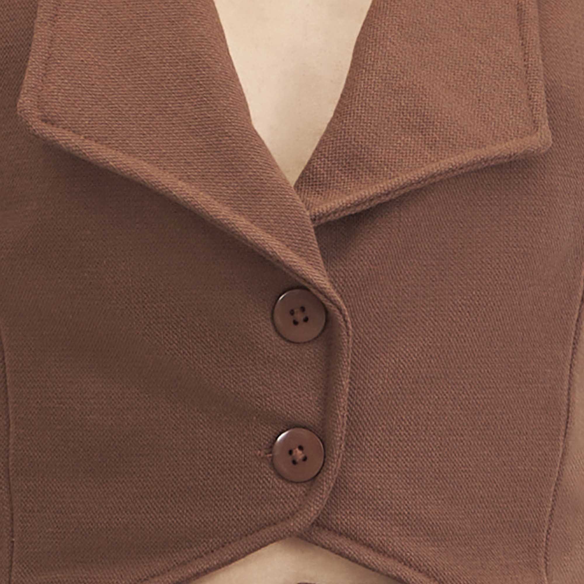 Colete em moletom com design de alfaiataria, combinando elegância e conforto. Possui fechamento frontal com dois botões e detalhe de lapela dobrada. Modelagem levemente curta, ideal para looks estilosos. Disponível nas cores: • Marrom: Tamanho M. • Preto: Tamanho G.