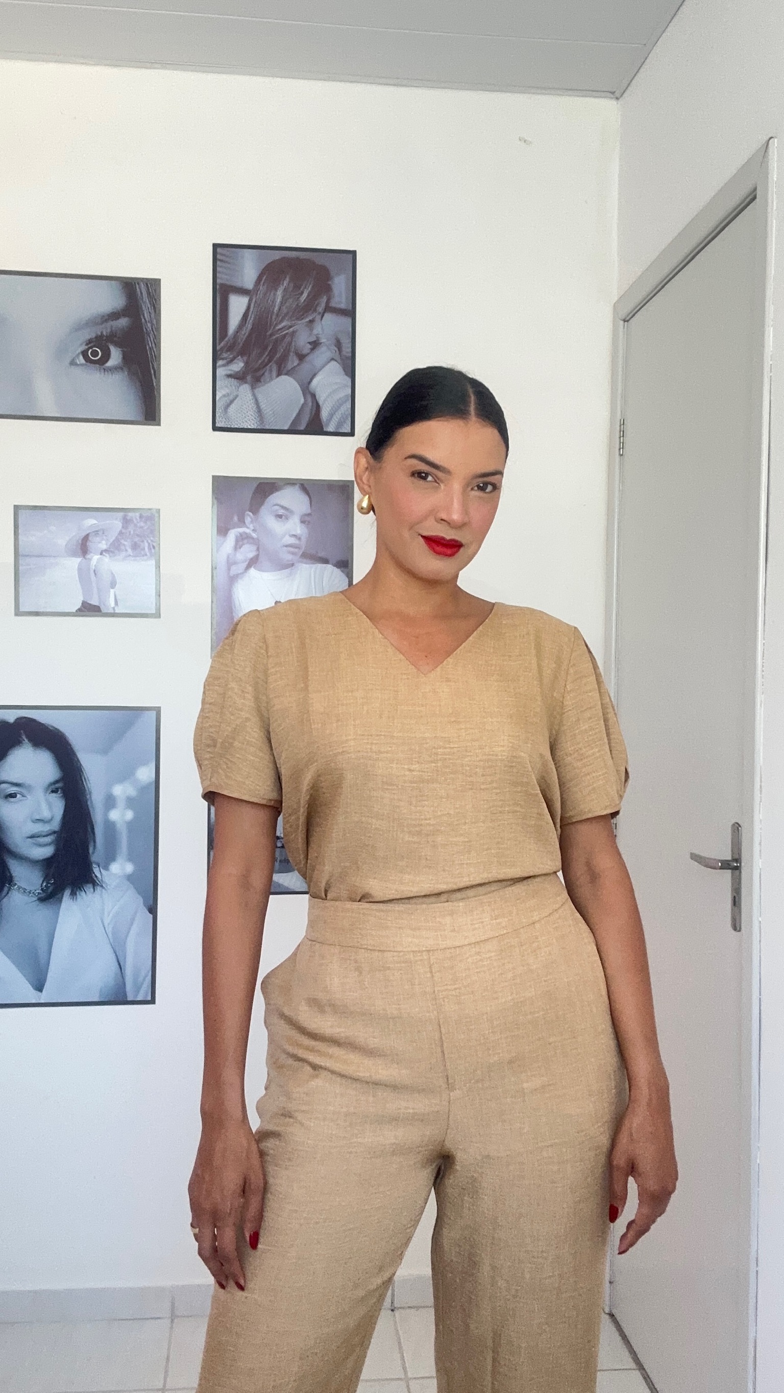 Descrição Detalhada: • Tecido: 100% poliéster, com acabamento que proporciona conforto e elegância. • Detalhes da Blusa: Decote V, manga com pregas no ombro, modelagem levemente soltinha que valoriza o busto e alonga o colo. • Detalhes da Calça: Modelagem reta com pala frontal, bolsos faca laterais, fechamento em zíper invisível na lateral. Ideal para quem busca praticidade e sofisticação. Estilo e Ocasiões: Versátil para eventos formais e casuais. Combine com salto para um look sofisticado ou com tênis para um visual moderno e descontraído. • Biotipos: A modelagem é ideal para quem deseja alongar a silhueta e valorizar a cintura, sendo perfeita para todos os tipos de corpo.