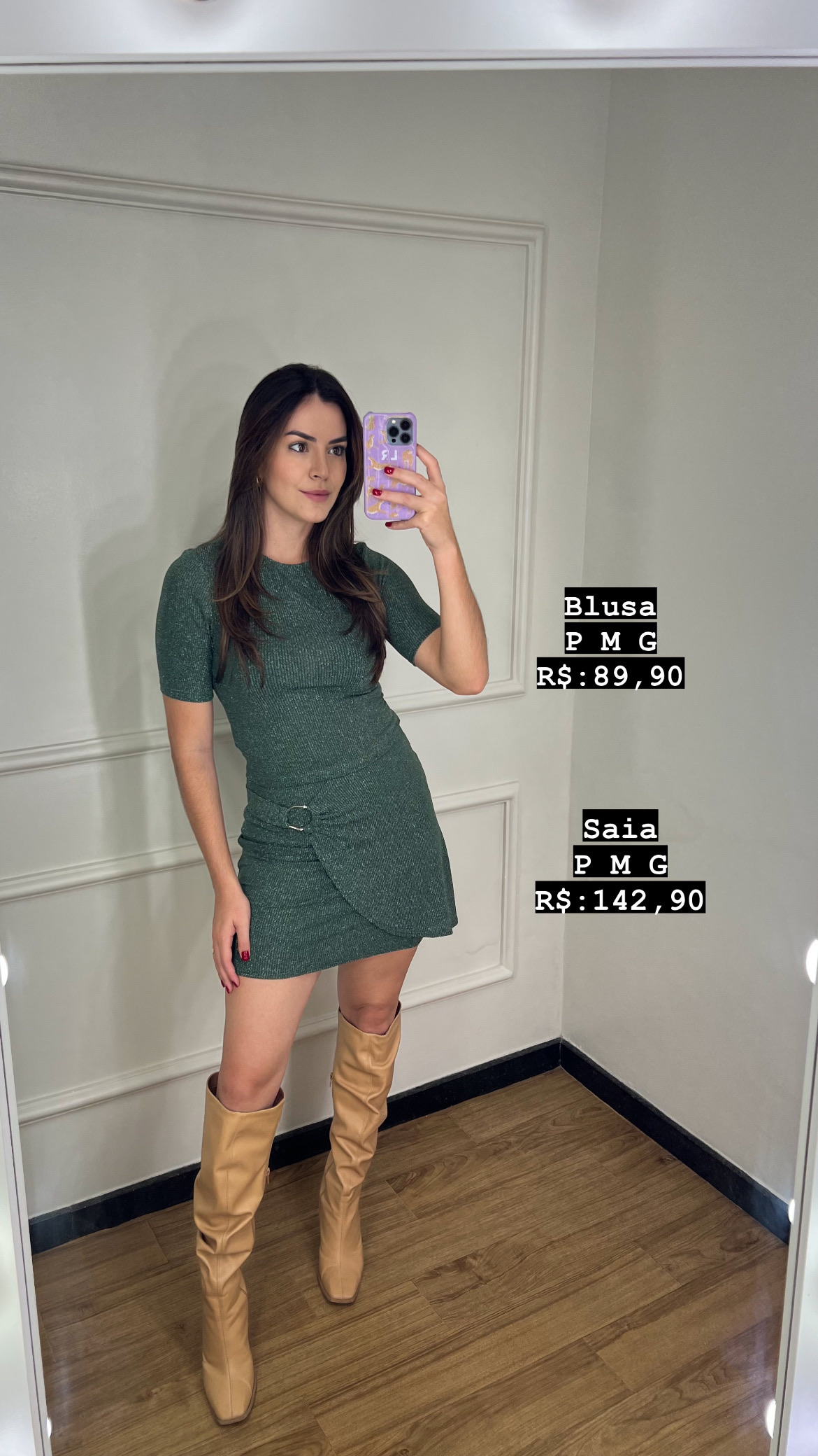 Descrição: Conjunto composto por blusa e saia, ambas na cor verde sálvia com fios metalizados, perfeitas para criar um look moderno e sofisticado. • Blusa: Modelagem ajustada, tecido com composição de 65% poliamida, 26% poliéster e 9% elastano. • Saia: Design forrado, com cintura detalhada e tecido de alta qualidade. Composição do corpo: 65% poliamida, 26% poliéster e 9% elastano. Forro: 95% poliéster e 5% elastano. Referências: • Blusa: 103858 • Saia: 103817
