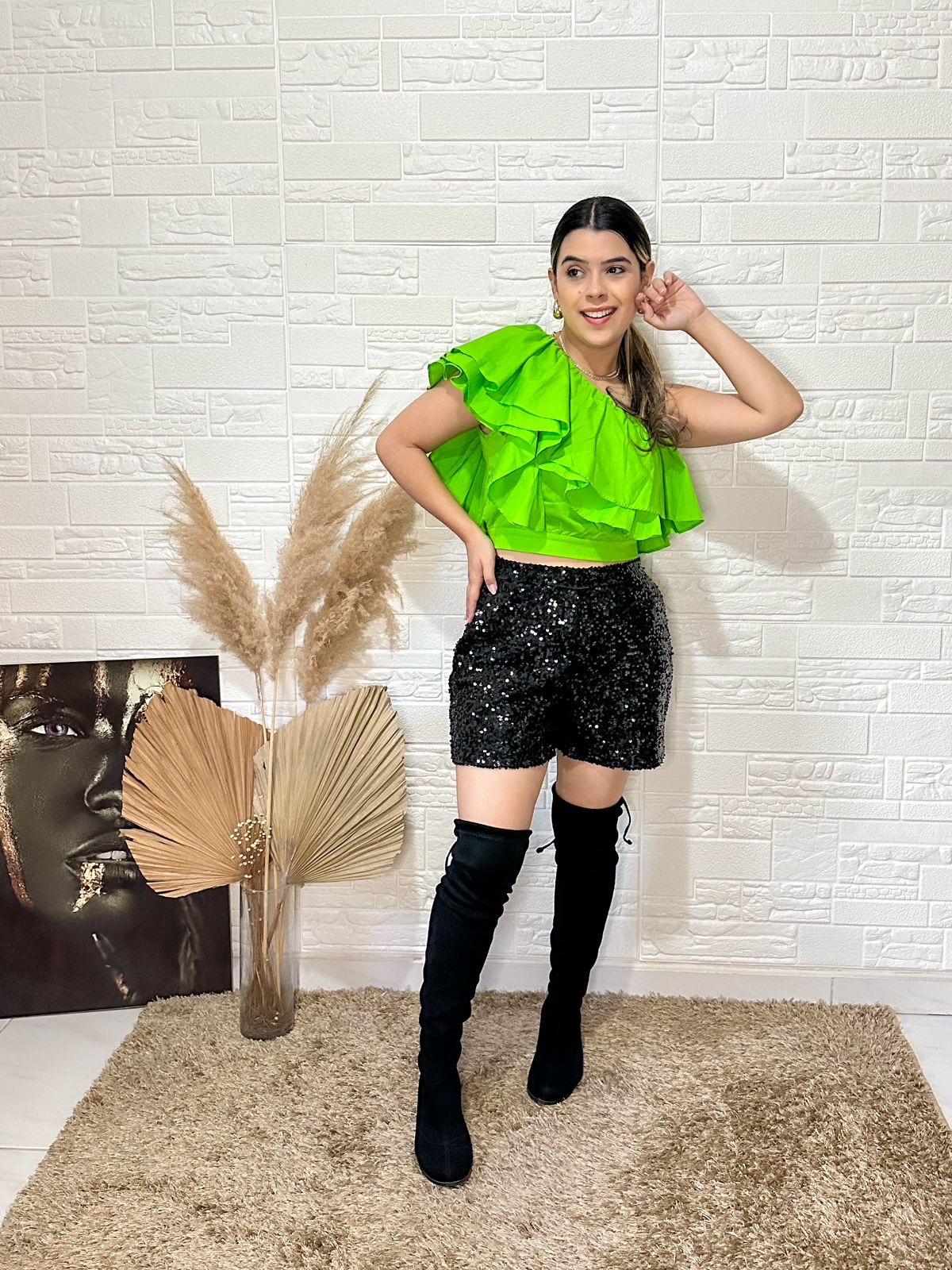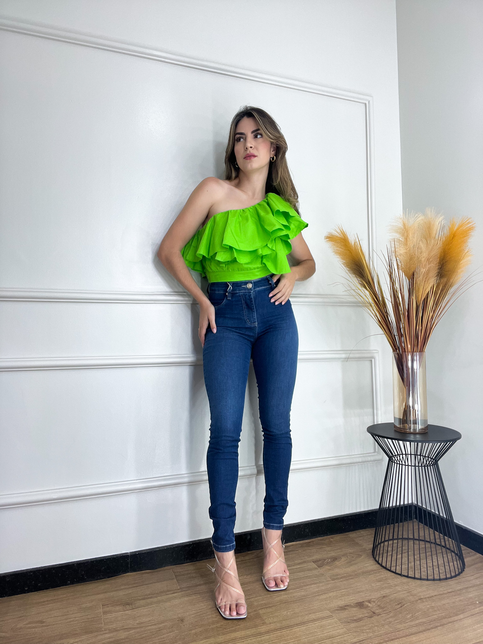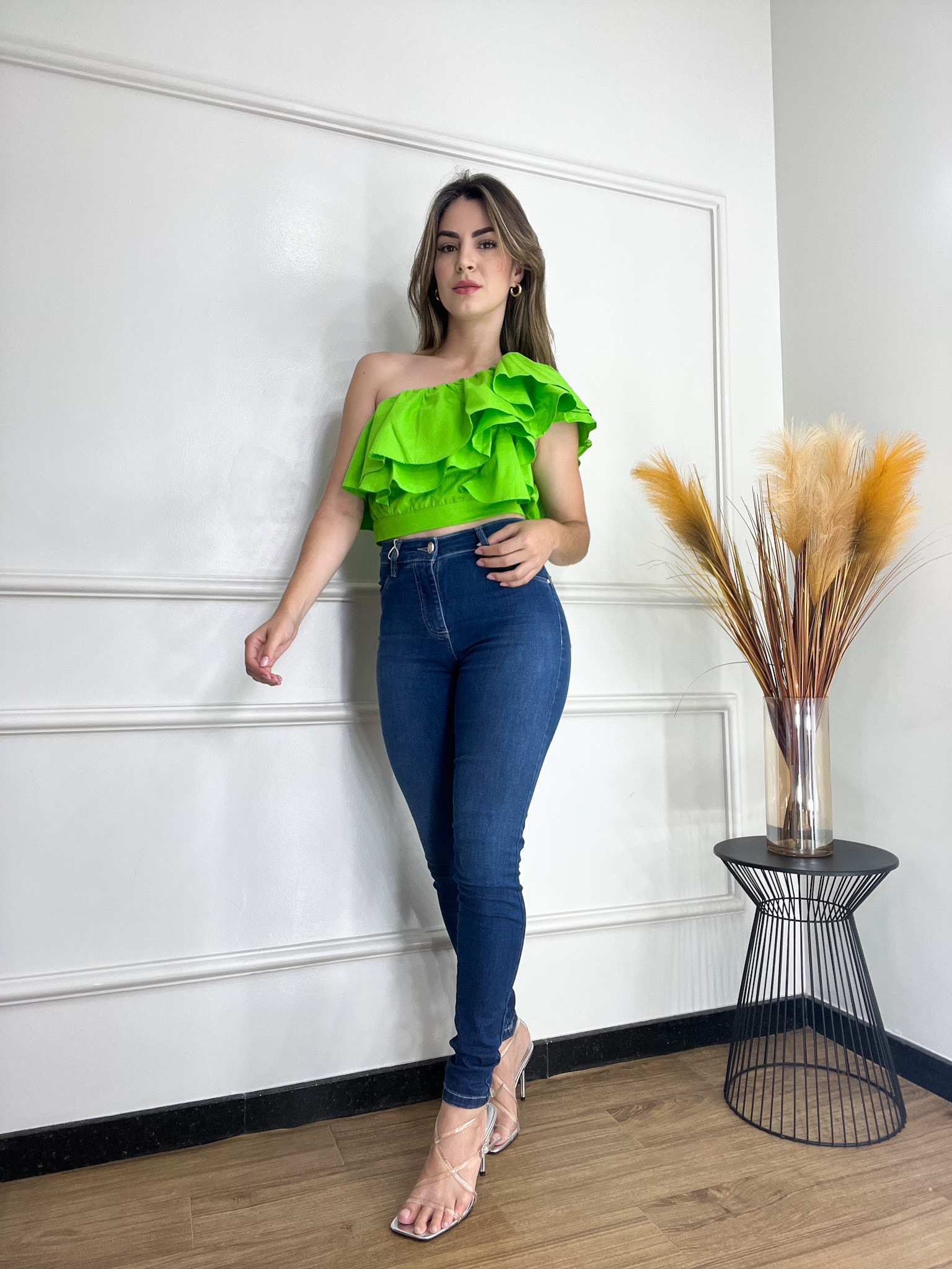 Cropped confeccionado em 100% algodão, com tecido tricoline de alta qualidade. Possui design de um ombro só com babados volumosos, fechamento lateral com zíper reforçado, garantindo ajuste perfeito. Ideal para criar looks sofisticados e modernos.