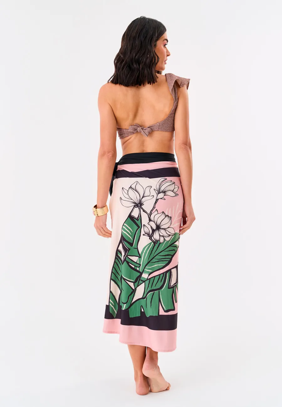Composição: 96% poliéster, 4% elastano Descrição: Leve, fluida e cheia de charme, a saída de praia da Doce Trama transforma qualquer look de verão. Com fenda lateral e estampa tropical, é uma peça versátil que pode ser usada tanto na praia quanto em produções casuais.