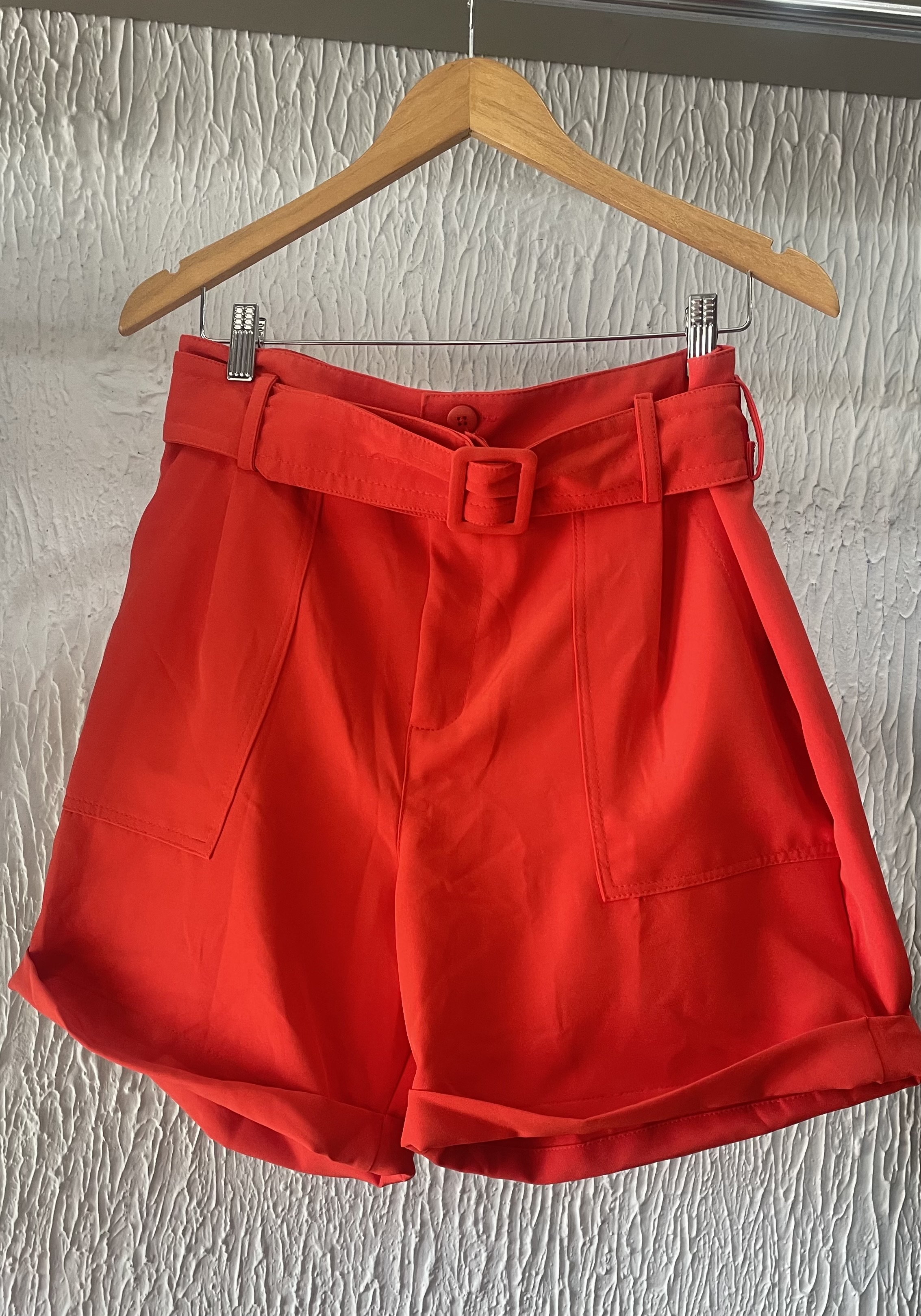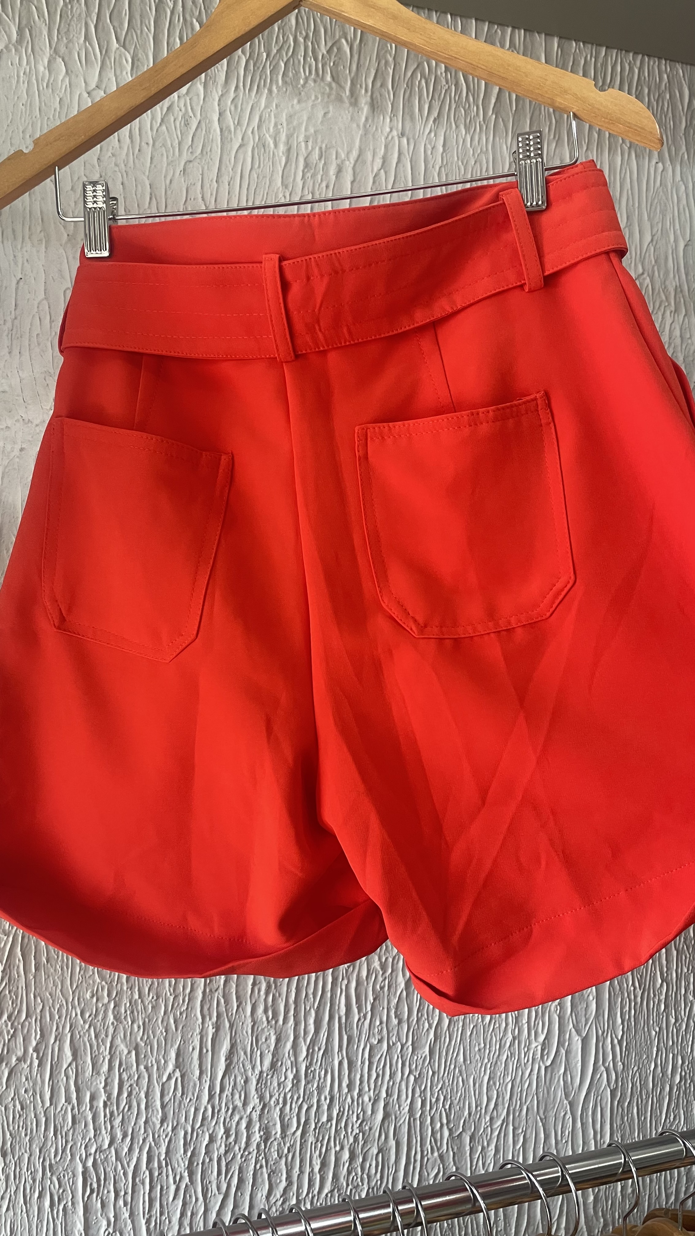 Short bermuda de cintura alta, confeccionado em tecido premium com elastano, acompanha cinto do próprio tecido, com fechamento frontal em zíper e dois botões. Possui bolsos faca frontais e bolsos traseiros, com dobra na barra. • Composição: 90% poliéster, 10% elastano