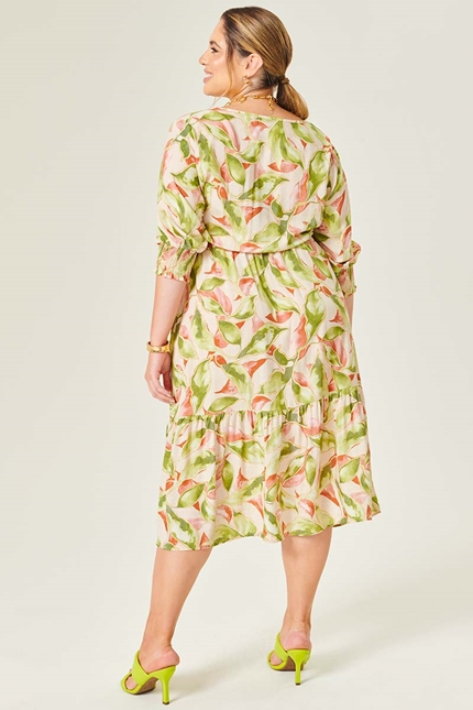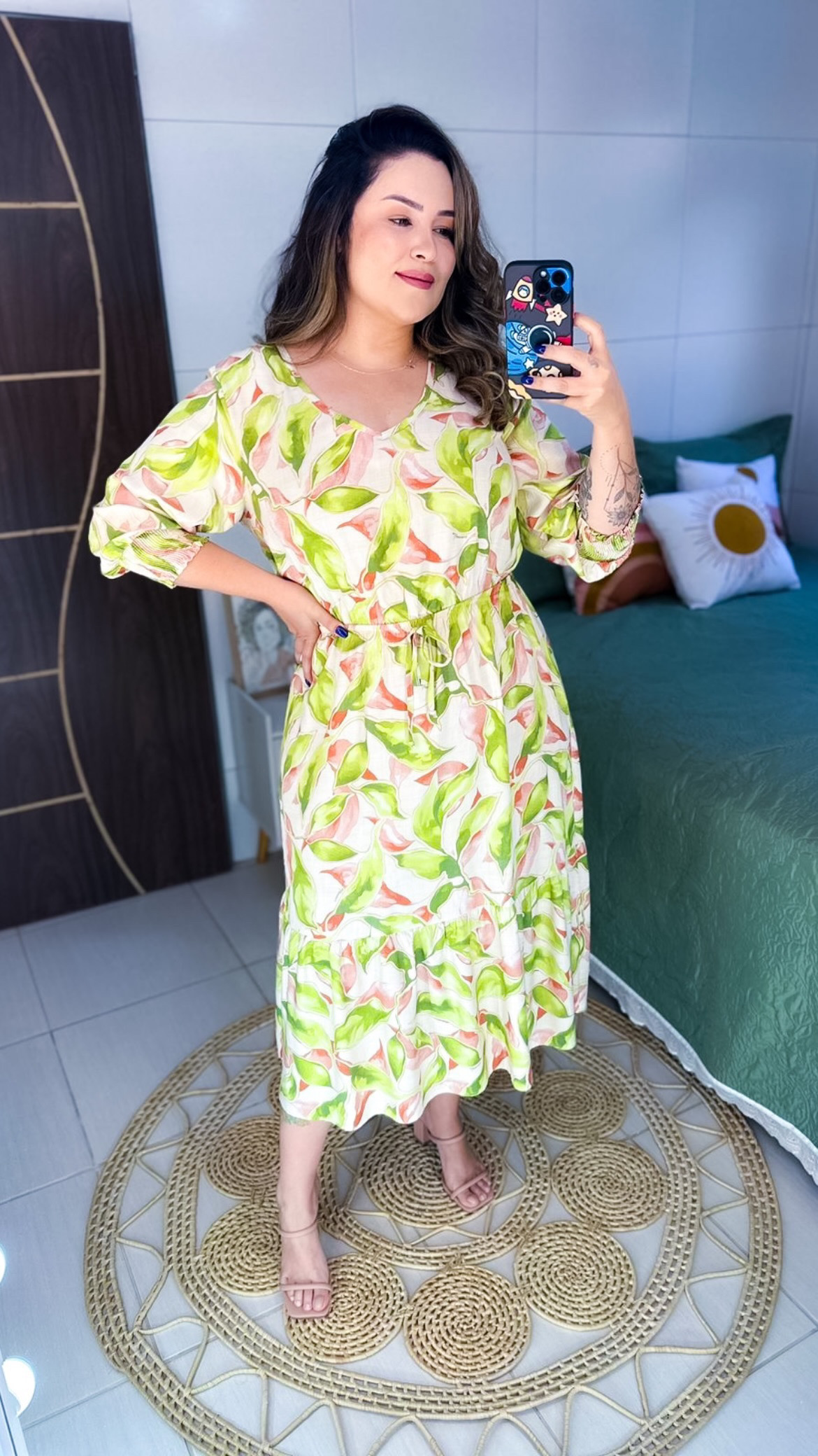 Elegância e conforto definem este vestido da marca Lisamour, confeccionado em viscose de alta gramatura, garantindo qualidade e caimento perfeito. Com uma estampa vibrante e moderna na cor Butter, o modelo é ideal para quem busca praticidade e estilo. Possui manga 3/4 com detalhes em elastex nos punhos, decote em V e elástico na cintura, acompanhado de uma amarração decorativa que complementa o visual sem franzir. Sua modelagem fluida e acabamento impecável o tornam uma peça versátil para diversas ocasiões.