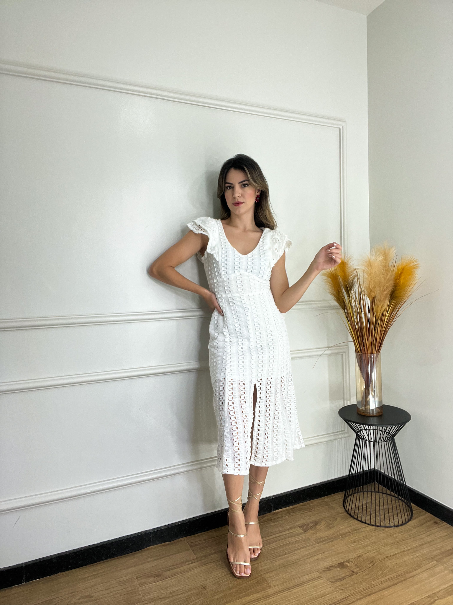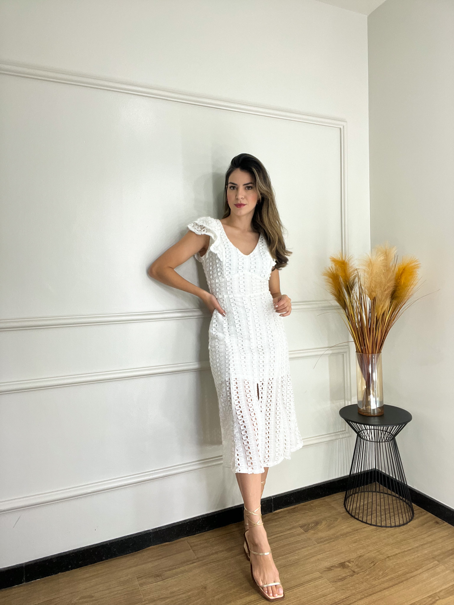 Descrição: Vestido midi em estilo crochet com design sofisticado e delicado. • Confeccionado em material forrado para maior conforto e segurança. • Detalhe de babados nas mangas, trazendo charme e leveza ao look. • Fechamento em zíper na parte traseira. Uma peça ideal para eventos formais ou ocasiões especiais, unindo elegância e modernidade.