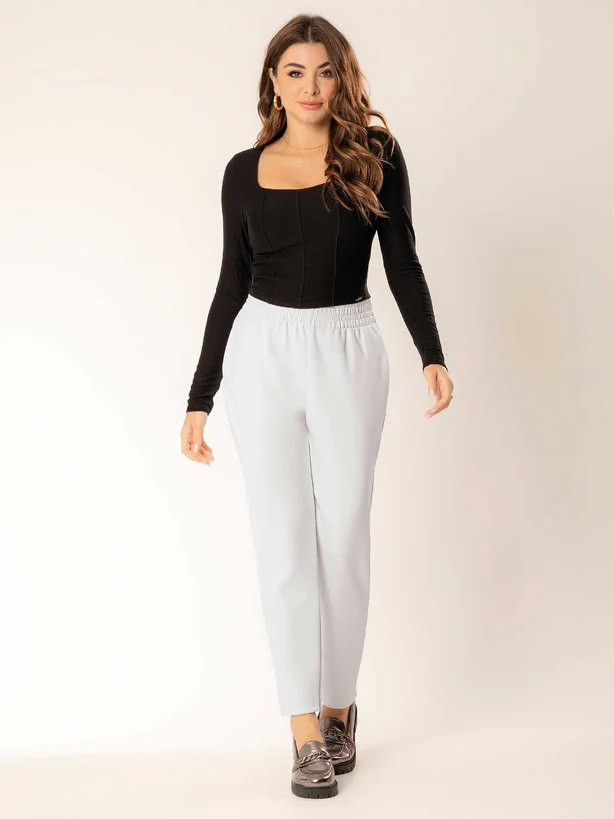 A Blusa Feminina Adulto de manga longa, com decote quadrado e corpete estilo corselet, é confeccionada em canelado napoleão. Esta peça estruturada valoriza a silhueta com elegância, oferecendo um visual refinado e sofisticado.