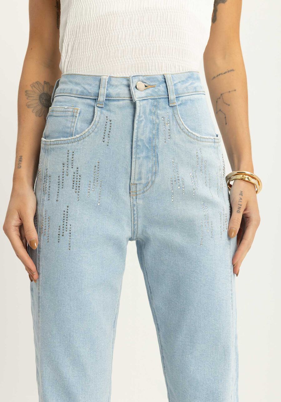 Calça Mom Jeans Com Strass E Cintura Alta Chapa Barriga