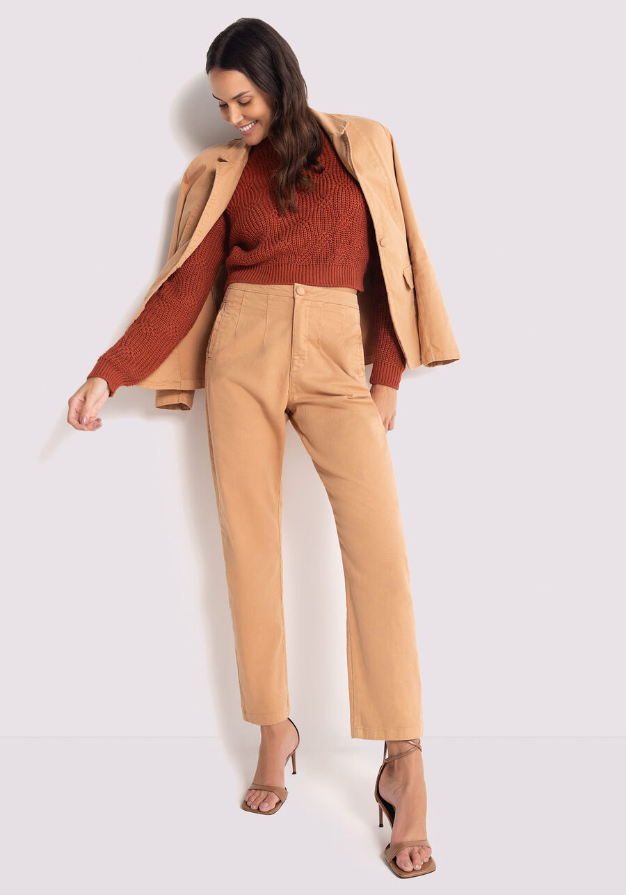 Para mulheres autênticas que buscam um look sofisticado em qualquer ocasião, essa calça reta é a escolha certa! Unindo a elegância da alfaiataria com o toque moderno da Sarja, ela tem caimento estruturado e valoriza o corpo através da tecnologia Chapa Barriga. Com blazer no mesmo tom e blusa de gola alta, cria um look que vai do trabalho ao happy hour com estilo. -Confeccionada em Sarja com Elastano -Modelagem reta -Inspirada na alfaiataria com pregas na frente -Bolsos funcionais -Botão forrado -Tingimento reativo que proporciona maior pigmento e durabilidade da cor -Jeans Lunender Chapa Barriga: acabamento interno que comprime a área abdominal, proporcionando efeito de "barriga chapada" -30% de elasticidade -Coleção Raízes