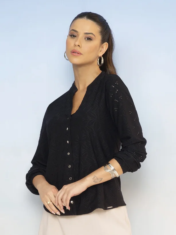 A camisa feminina adulto é confeccionada em malha laise fernanda, possui abertura em botões, mangas longas e um sutil detalhe de transparência. Seu decote em V adiciona um toque elegante à peça. Combinando estilo e conforto, esta camisa oferece um visual sofisticado com o detalhe de transparência, ideal para diversas ocasiões, proporcionando um look delicado e moderno.