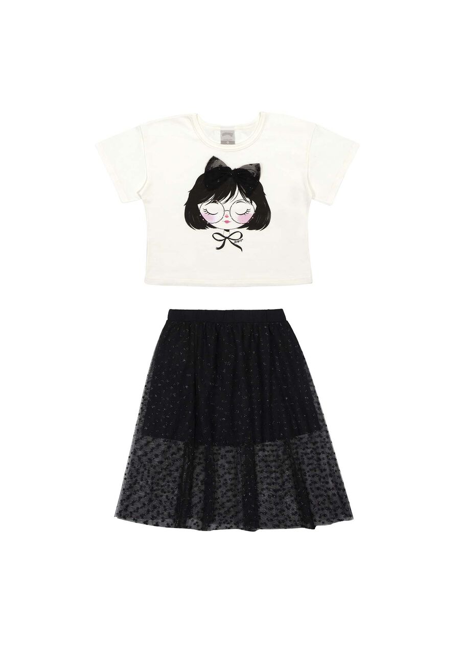 Conjunto Menina Com Blusa Estampada E Saia Midi Em Tule Um look mágico e cheio de charme! A blusa estampada com strass inspira delicadeza e combina perfeitamente com a saia midi em tule. Ideal para as meninas que adoram se destacar com estilo e muito conforto! Blusa em meia malha penteada Mangas curtas Gola redonda Estampa frontal com strass Saia forrada com parte externa em tule Modelagem evasê Comprimento midi