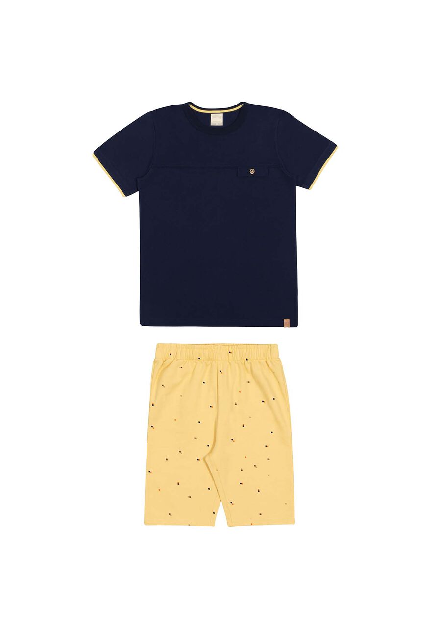 Conjunto Curto Infantil Menino Algodão Com Bermuda Estampada 60 Com uma camiseta de algodão leve e detalhe frontal estiloso, este conjunto Alakazoo se destaca na diversão. A bermuda em moletom com estampa minimalista proporciona liberdade para explorar sem preocupações! 206 Feito com algodão responsável Produção com menor impacto ambiental Camiseta em meia malha penteada Mangas curtas Gola redonda Detalhe frontal de aba com botão Bermuda em moletom estampado