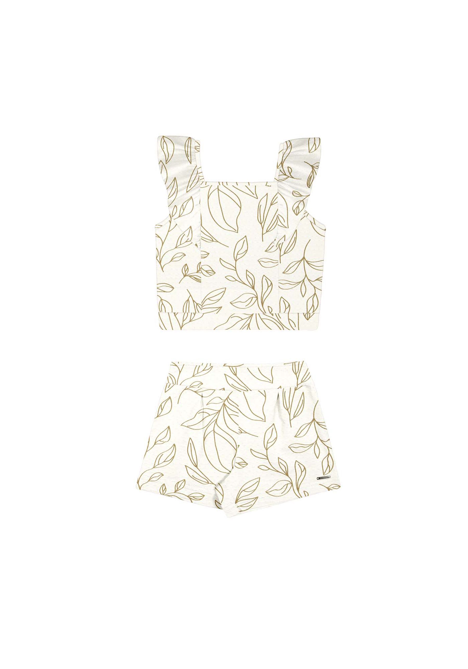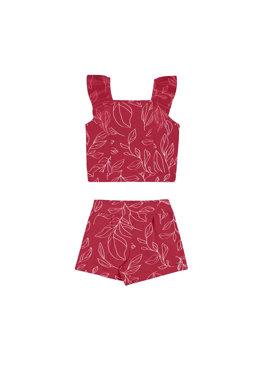 Conjunto Curto Menina Com Blusa E Shorts Em Malha Estampada Estilo e conforto para a estação! A blusa de alças e o shorts com pregas formam o conjunto ideal para aventuras. Sua estampa moderna é a escolha perfeita para compor looks que se destacam sem esforço! Feito com algodão responsável Produção com menor impacto ambiental Malha macia com elastano Textura com poás em relevo Blusa com modelagem reta Mangas curtas com babados Shorts com modelagem evasê Pregas frontais