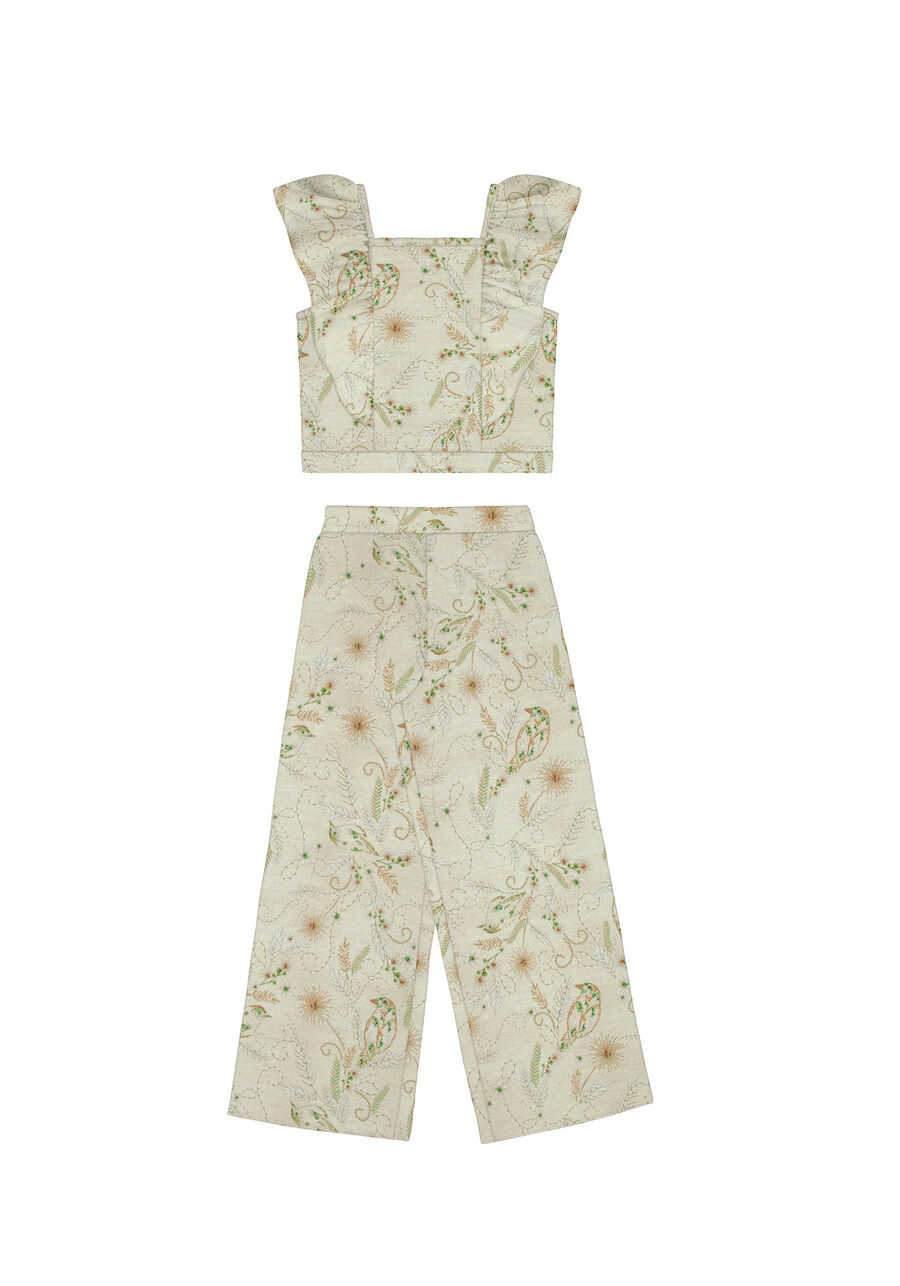 Conjunto Alakazoo bem confortável e moderno para os momentos especiais. Feito em viscose, tem um caimento bem leve e cheio de movimento, principalmente na calça wide leg. Já a blusa com babados traz um quê romântico ao visual das meninas, completado pela delicadeza da estampa floral, chamada "poesia". Tão lindo que as peças também podem ser usadas separadamente em outros looks! Confeccionado em Tecido Rayon Twill: tecido plano de viscose mais encorpado que o tradicional, mas que ainda mantém o caimento fluido Blusa mais curta com elástico embutido na barra Babados sobrepostos nos ombros Decote reto Calça wide leg solta ao corpo Elástico na cintura Estampa rotativa: podem ocorrer variações na localização dos elementos Viscose responsável feita a partir da celulose da madeira, seguindo padrões socioambientais em sua produção Coleção Frescor
