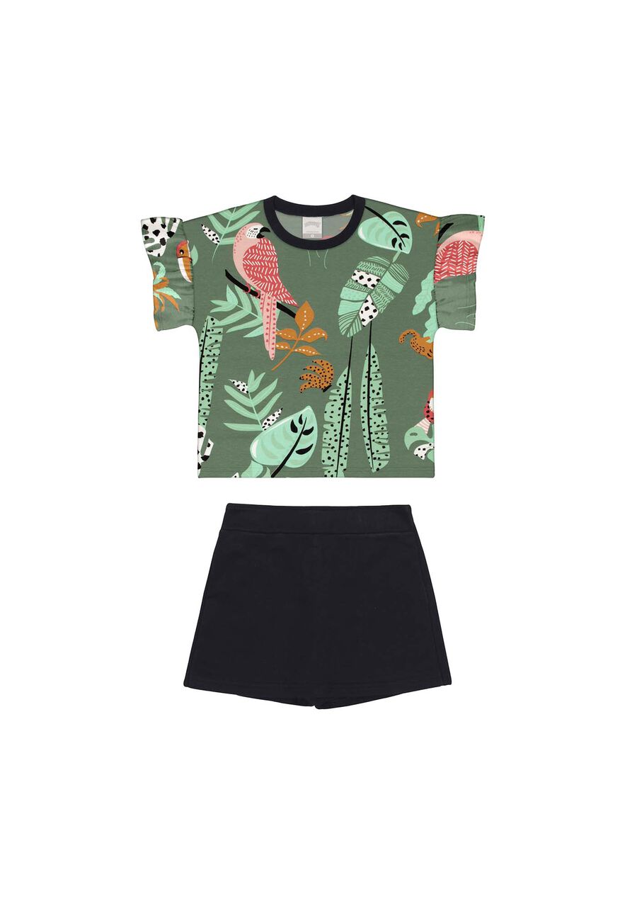 Conjunto Infantil Menina Estampado Com Shorts Saia Liso Com blusa estampada e shorts saia liso, este conjunto infantil Alakazoo é perfeito para criar looks frescos e divertidos. A estampa inspirada na floresta traz alegria ao visual das pequenas exploradoras! Feito com algodão responsável Produção com menor impacto ambiental Blusa estampada em meia malha penteada Modelagem reta Mangas curtas com cavas deslocadas Gola redonda Shorts saia liso em moletom macio Modelagem evasê