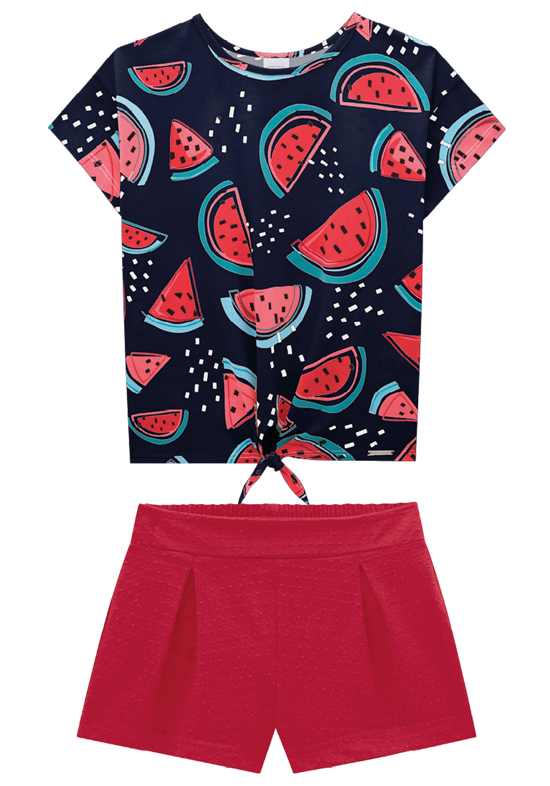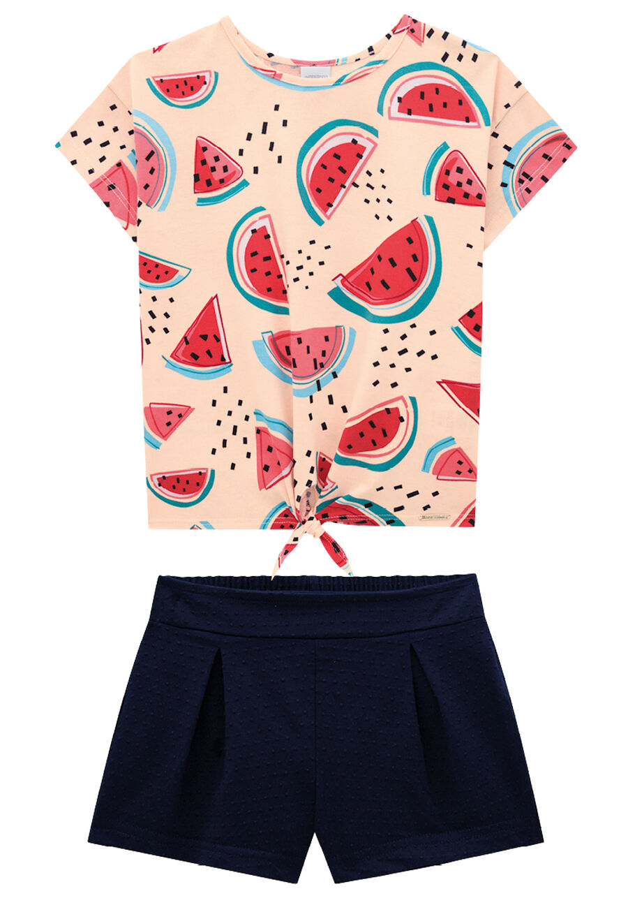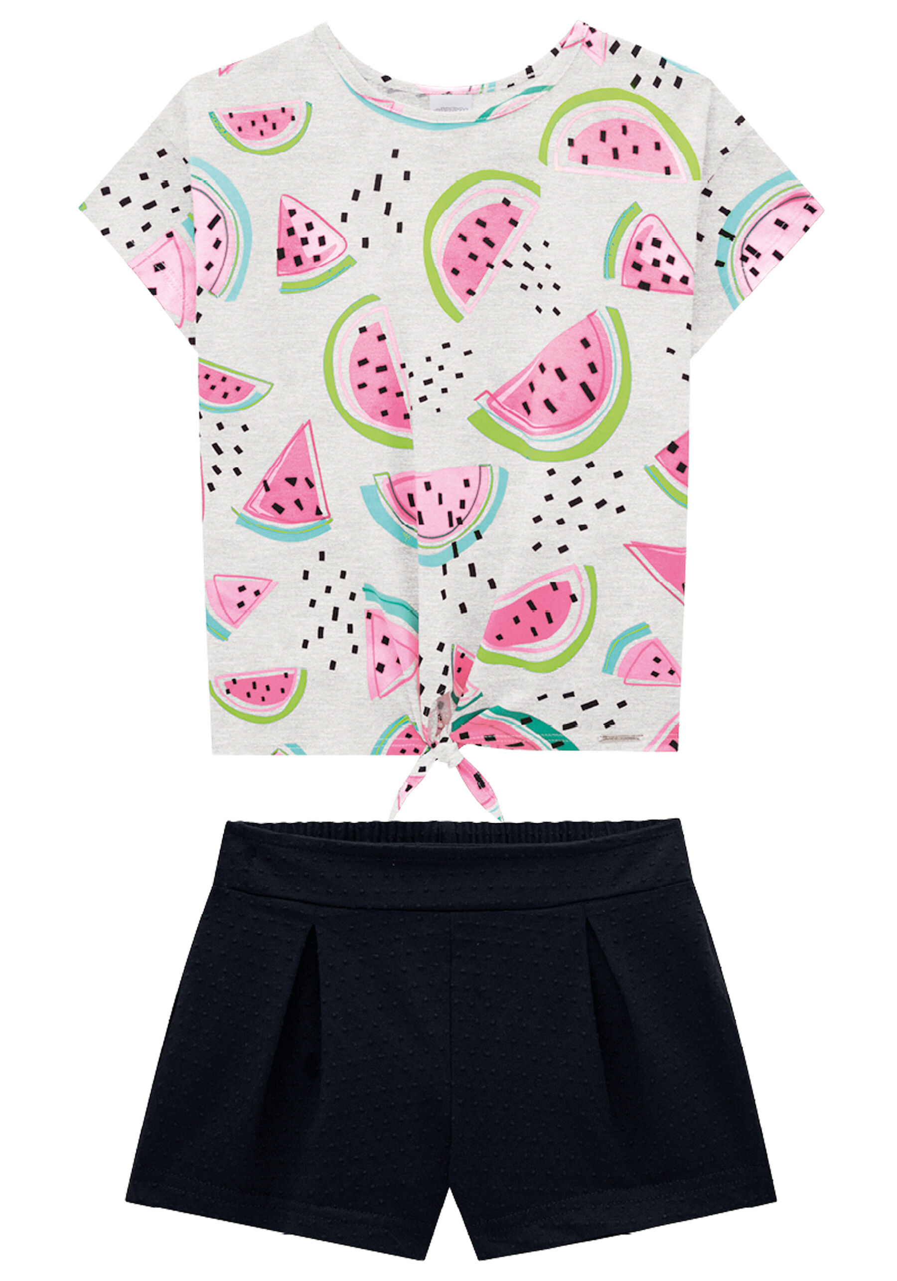 O Conjunto foi desenvolvido para as pequenas cheias de energia que adoram brincar com estilo! A Blusa em Meia Malha tem detalhe em amarração na frente e uma estampa cheia de cores que vai deixar os dias mais alegres. E o Shorts em Moletom com elástico no Cós, completa o look com muito conforto.