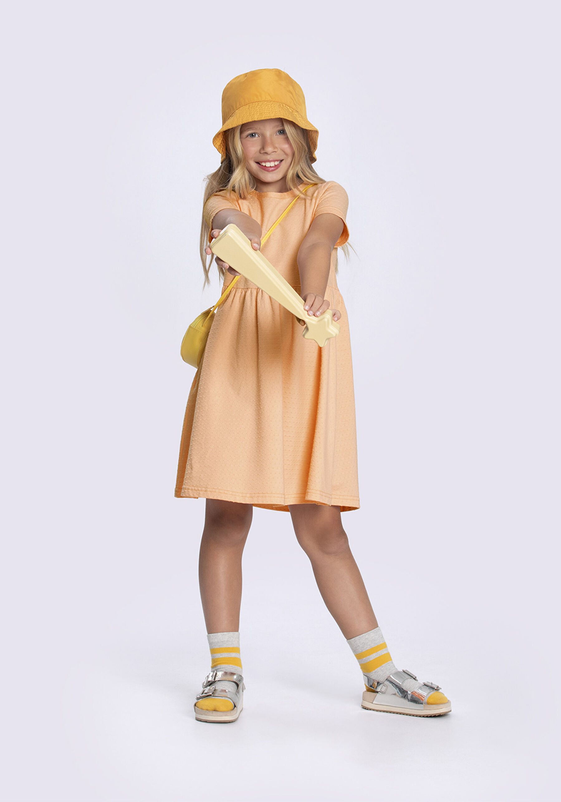 Vestido Curto Liso Básico Infantil Em Malha Texturizada Com malha macia e ecologicamente responsável, o vestido curto liso Alakazoo traz um charme extra com sua textura de poás. A modelagem evasê e as mangas curtas complementam o visual, garantindo um caimento perfeito. Feito com algodão responsável Produção com menor impacto ambiental Malha macia com elastano Textura com poás em relevo Modelagem evasê Comprimento curto Mangas curtas Gola redonda